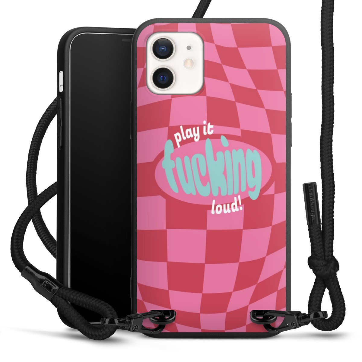 Pure Black: Handyhülle, Stoffband und Metalldetails in stylischem Mattschwarz.