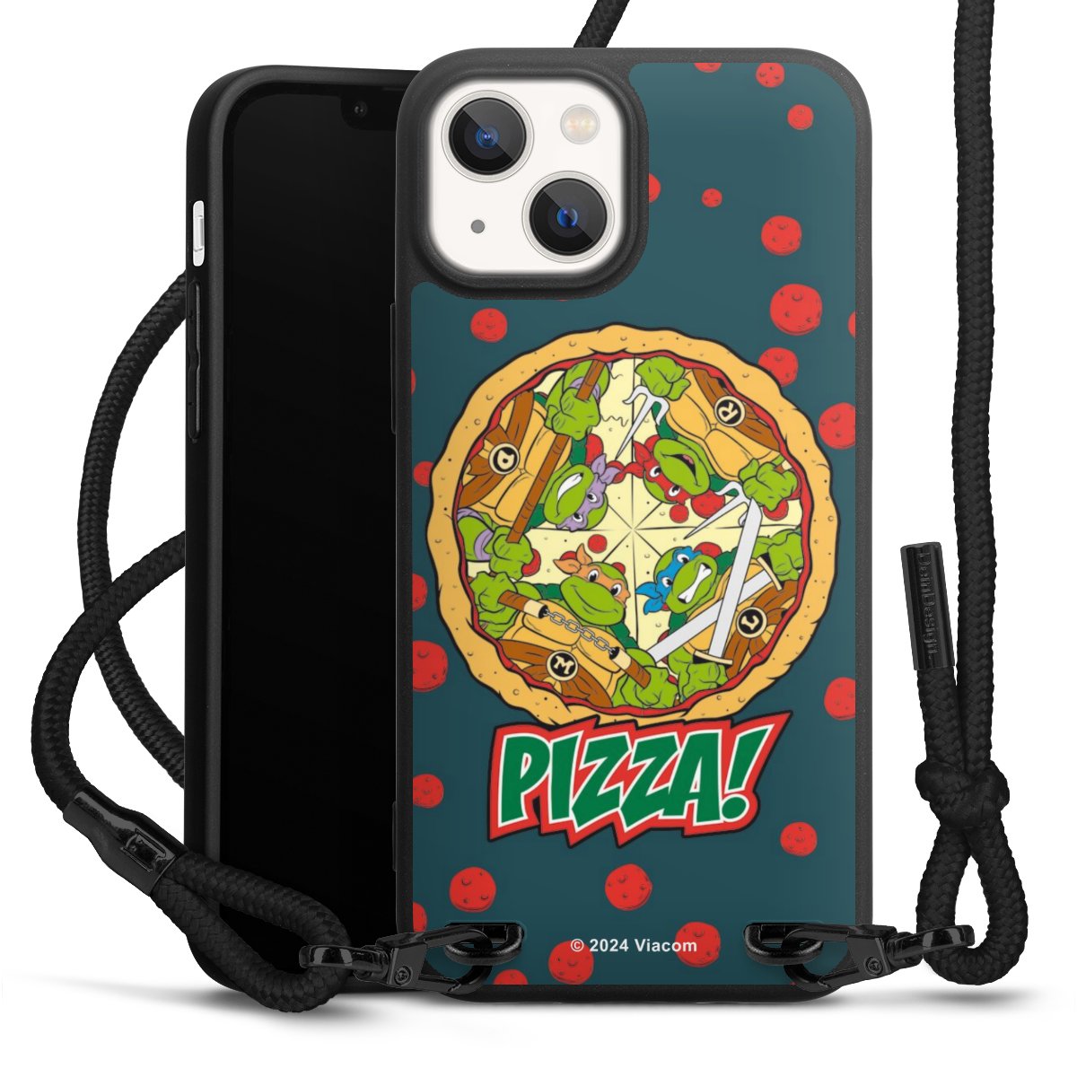 Pure Black: Handyhülle, Stoffband und Metalldetails in stylischem Mattschwarz.