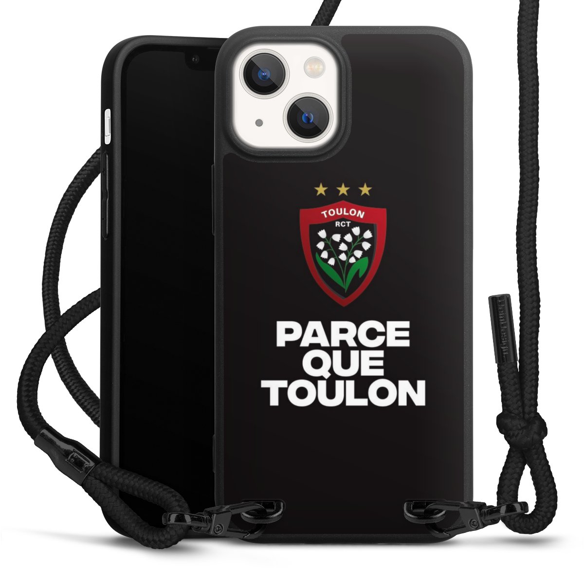 Pure Black: Handyhülle, Stoffband und Metalldetails in stylischem Mattschwarz.