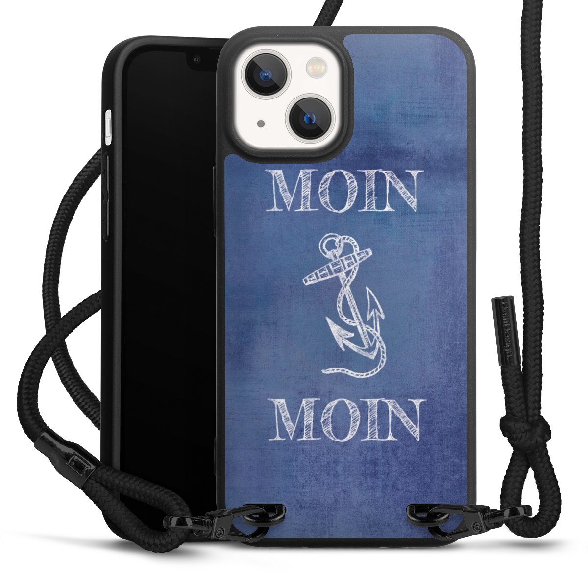 Pure Black: Handyhülle, Stoffband und Metalldetails in stylischem Mattschwarz.