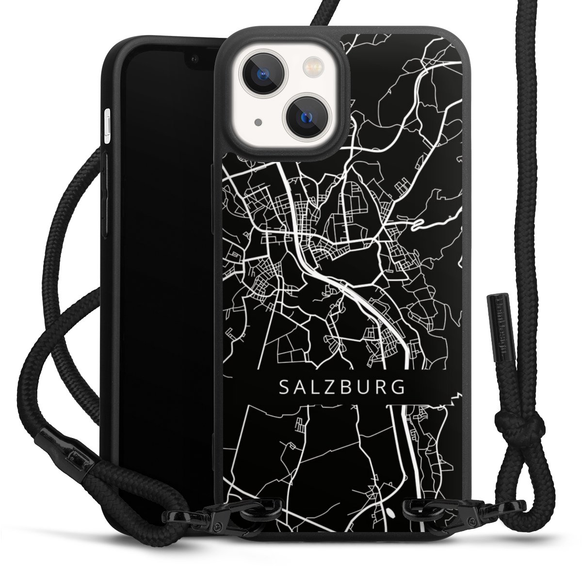 Pure Black: Handyhülle, Stoffband und Metalldetails in stylischem Mattschwarz.