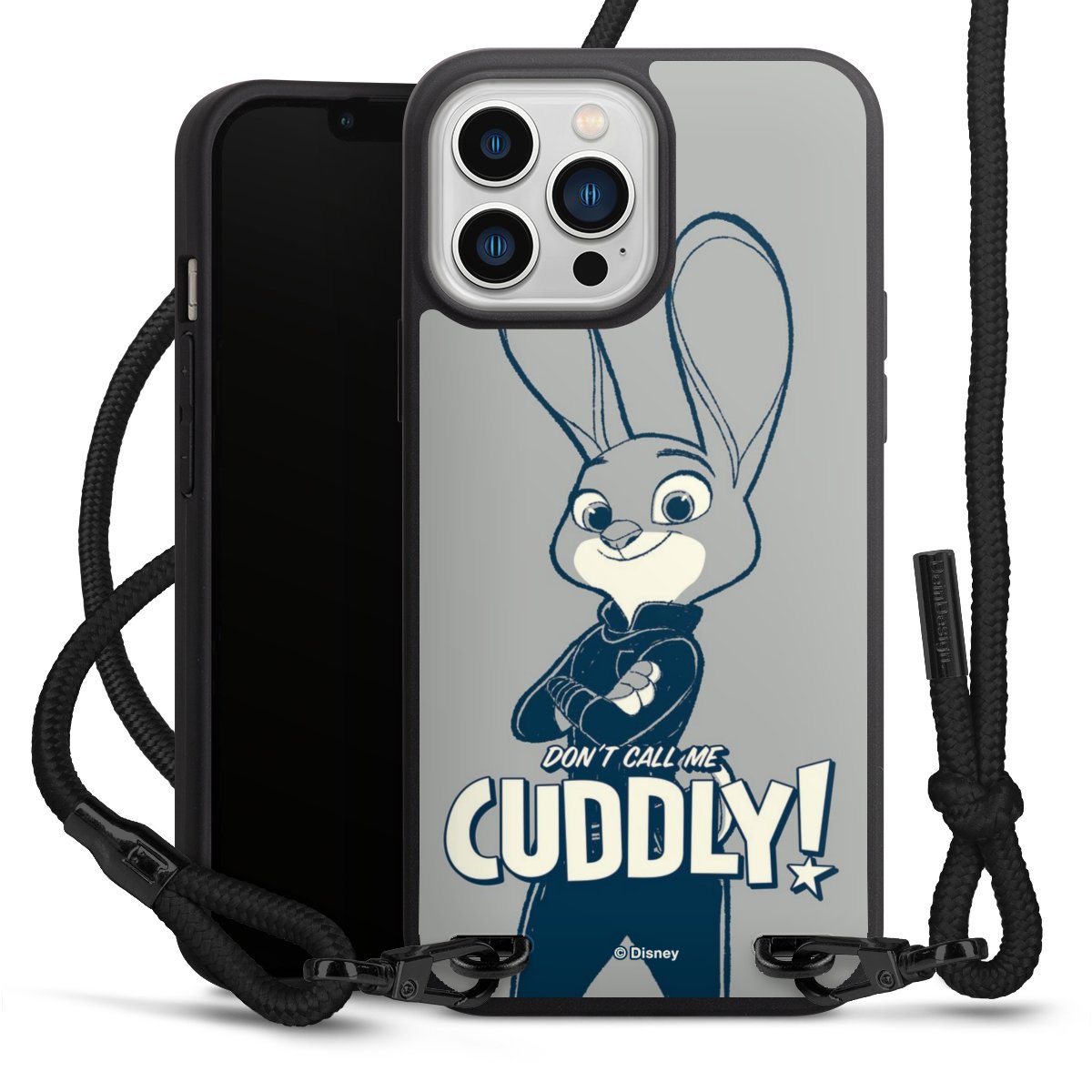 Pure Black: Handyhülle, Stoffband und Metalldetails in stylischem Mattschwarz.