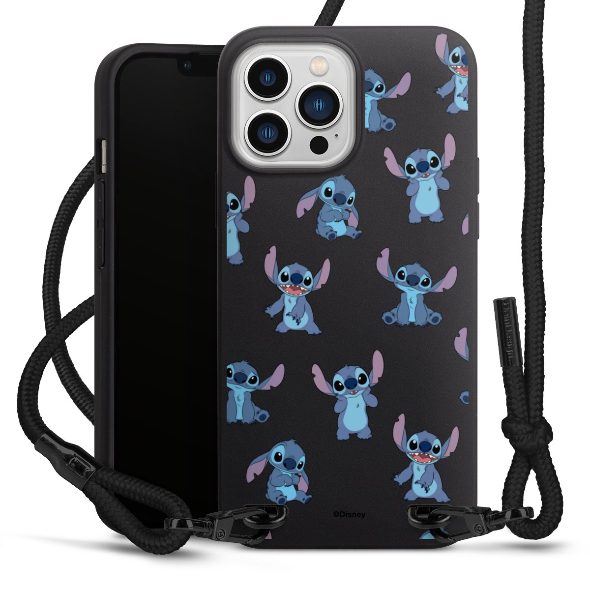 Pure Black: Handyhülle, Stoffband und Metalldetails in stylischem Mattschwarz.