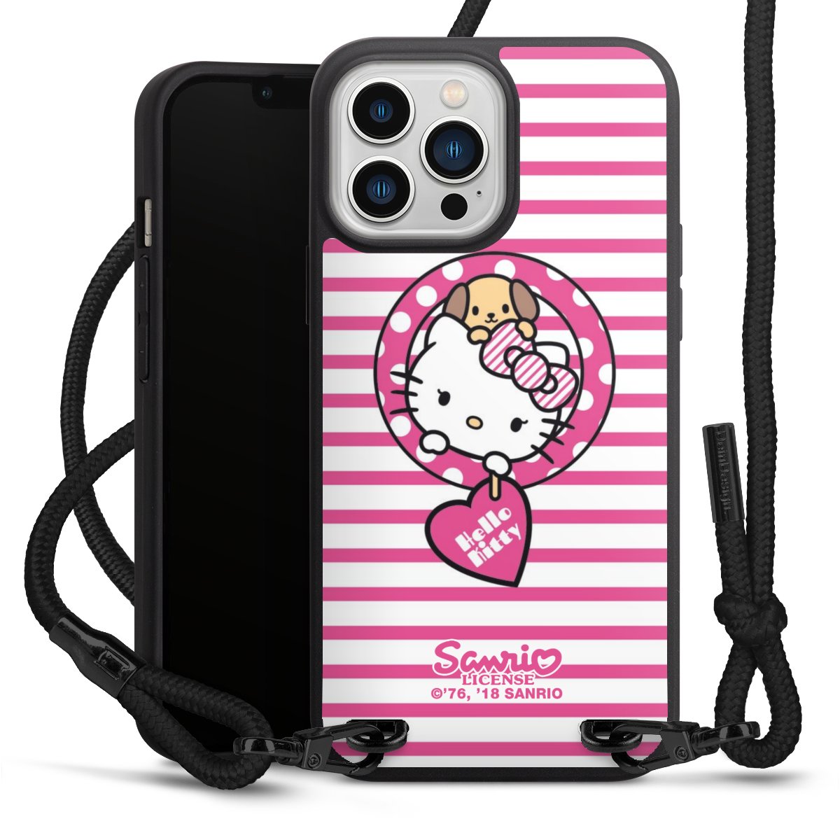 Pure Black: Handyhülle, Stoffband und Metalldetails in stylischem Mattschwarz.