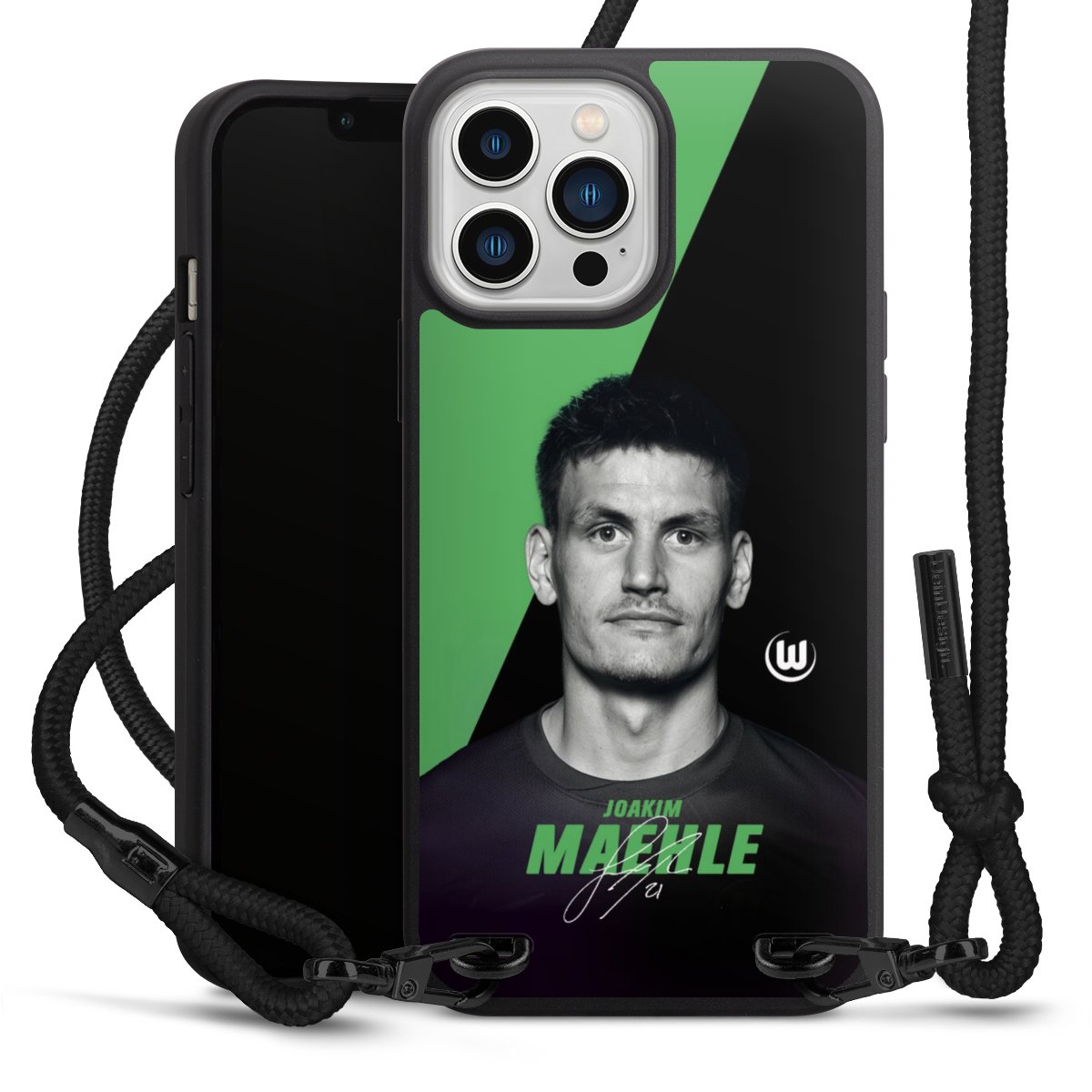 Pure Black: Handyhülle, Stoffband und Metalldetails in stylischem Mattschwarz.