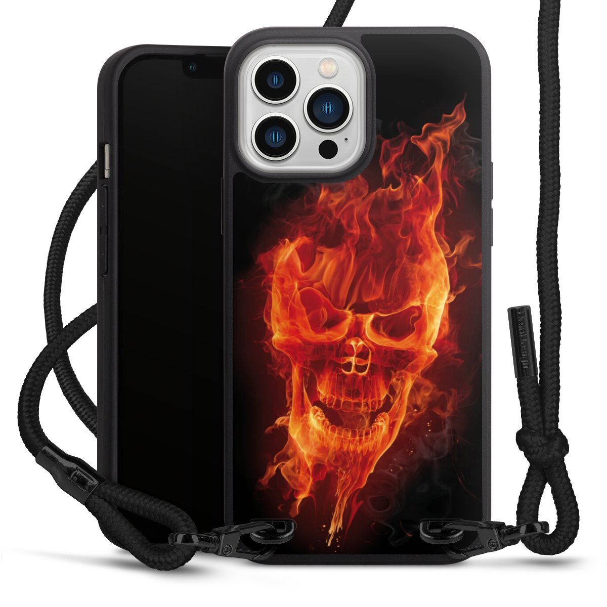 Pure Black: Handyhülle, Stoffband und Metalldetails in stylischem Mattschwarz.