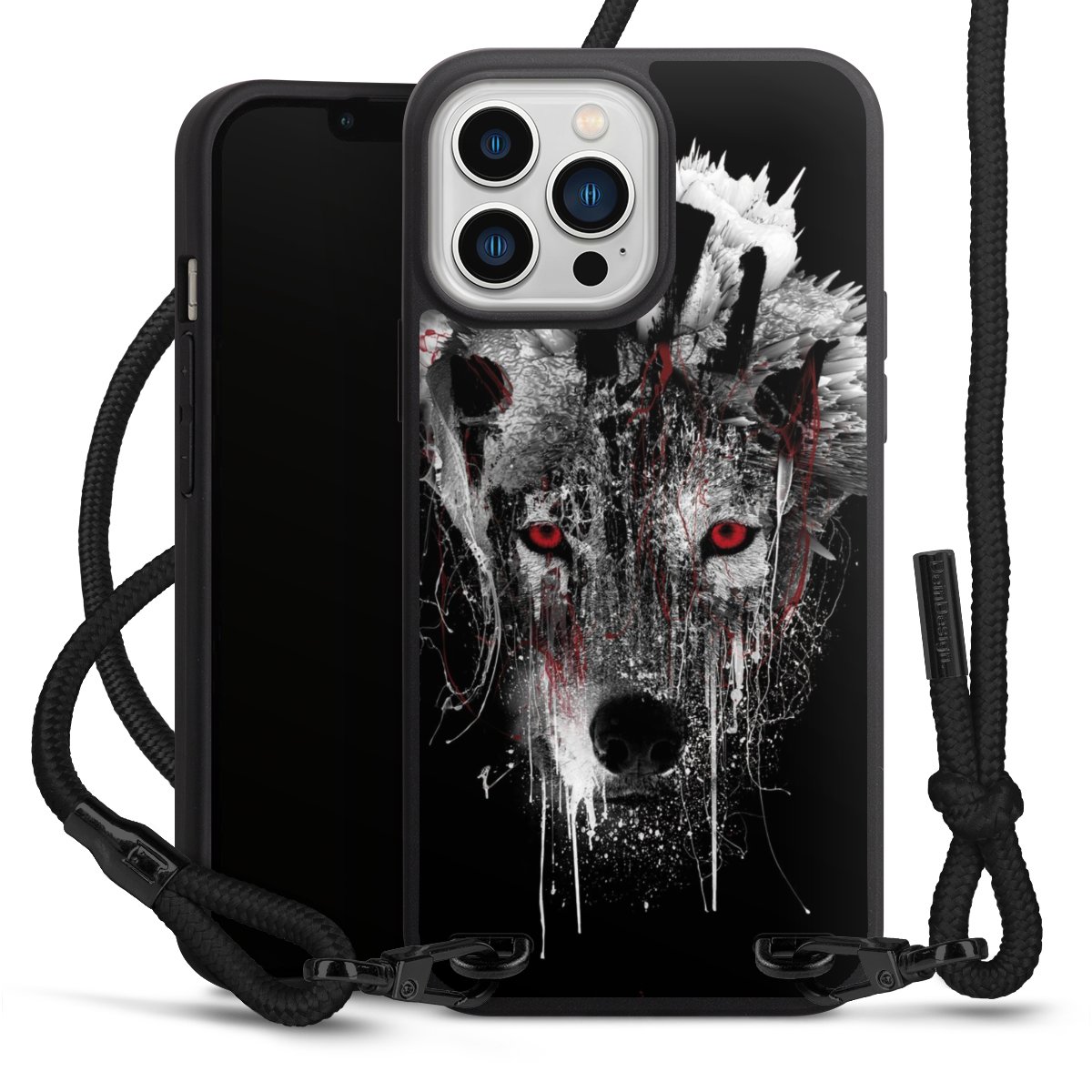Pure Black: Handyhülle, Stoffband und Metalldetails in stylischem Mattschwarz.