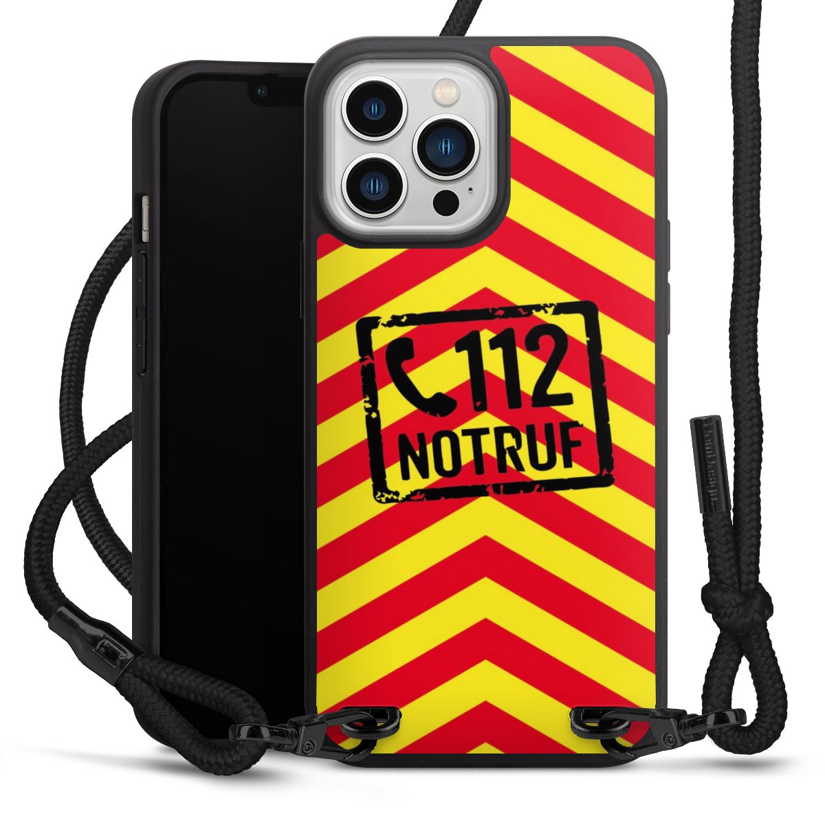 Pure Black: Handyhülle, Stoffband und Metalldetails in stylischem Mattschwarz.