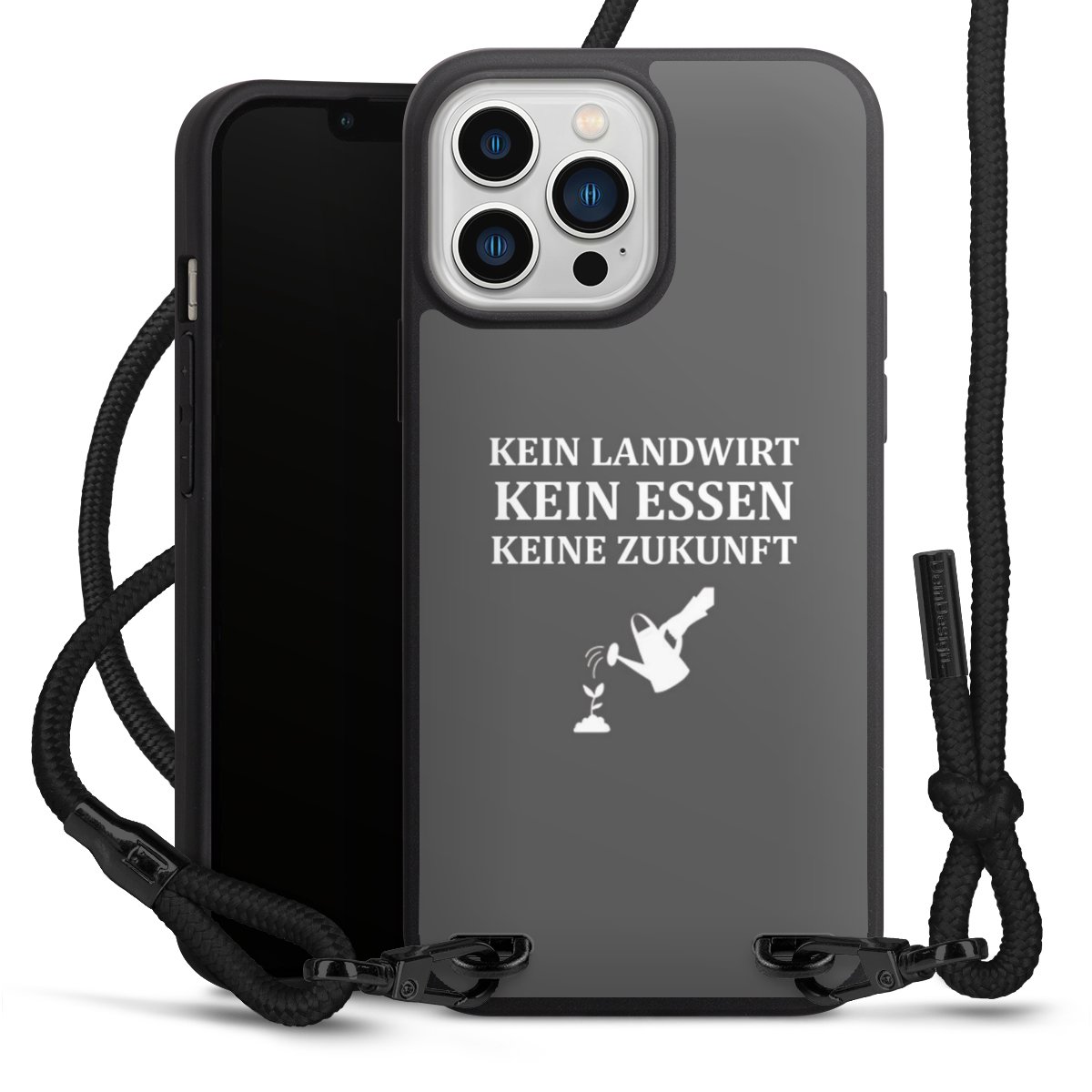Pure Black: Handyhülle, Stoffband und Metalldetails in stylischem Mattschwarz.
