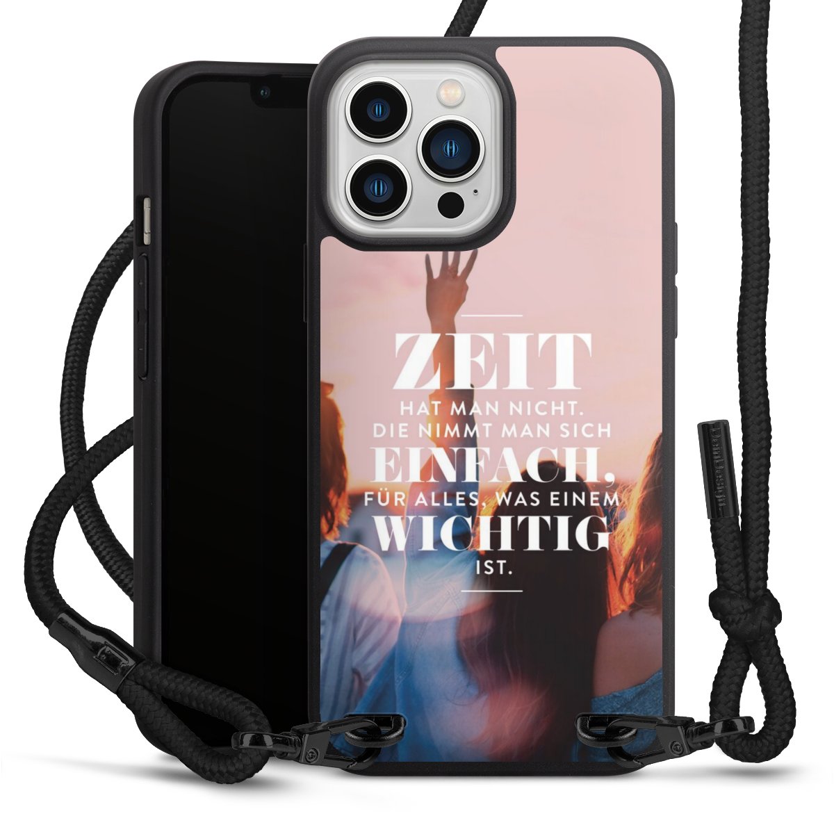 Pure Black: Handyhülle, Stoffband und Metalldetails in stylischem Mattschwarz.
