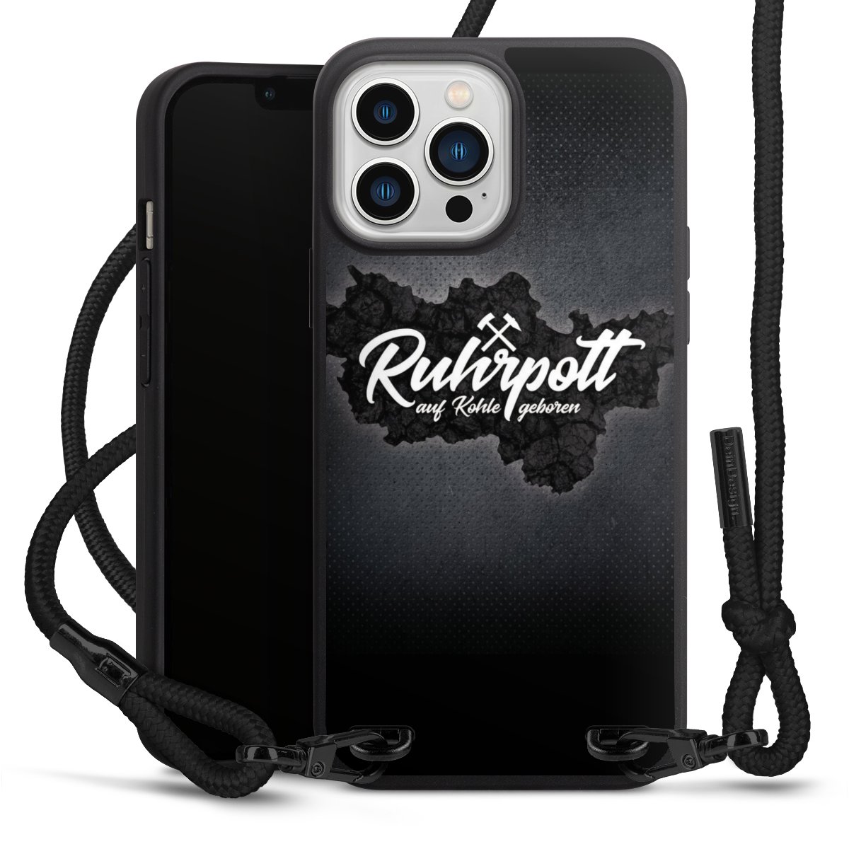 Pure Black: Handyhülle, Stoffband und Metalldetails in stylischem Mattschwarz.