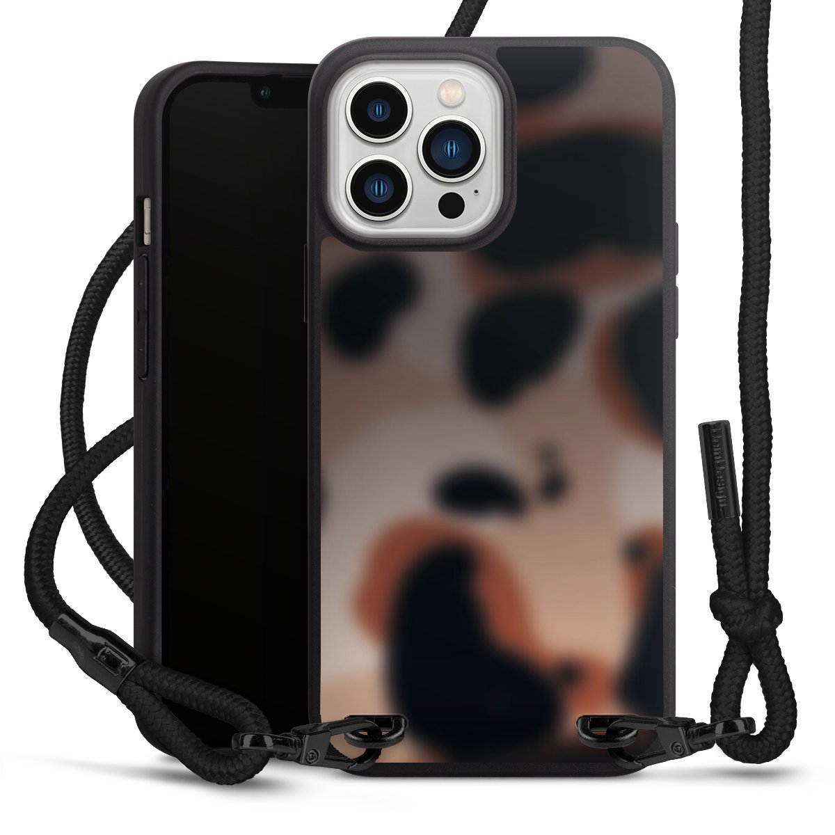 Pure Black: Handyhülle, Stoffband und Metalldetails in stylischem Mattschwarz.