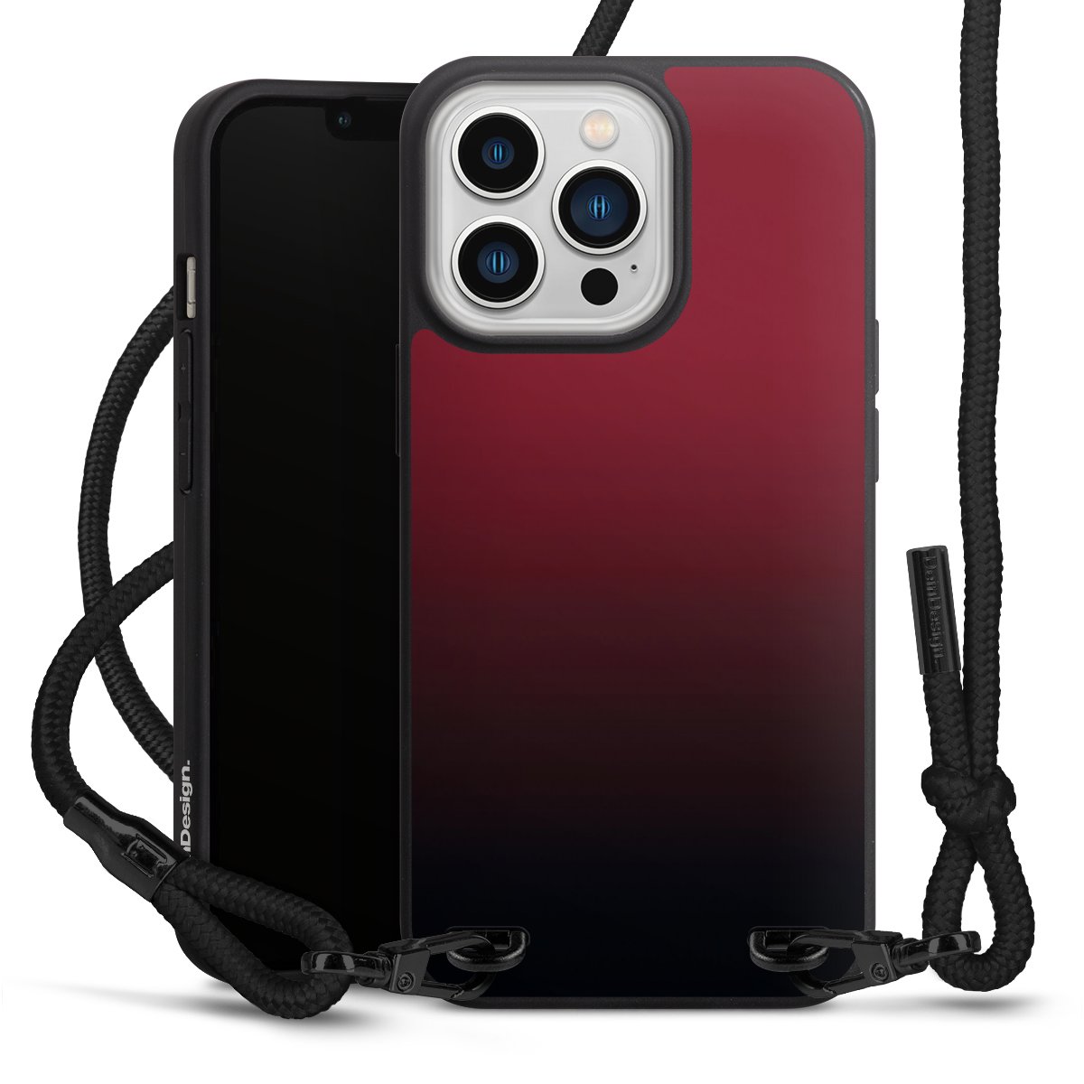 Pure Black: Handyhülle, Stoffband und Metalldetails in stylischem Mattschwarz.