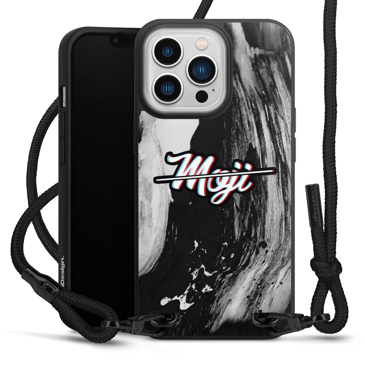 Pure Black: Handyhülle, Stoffband und Metalldetails in stylischem Mattschwarz.