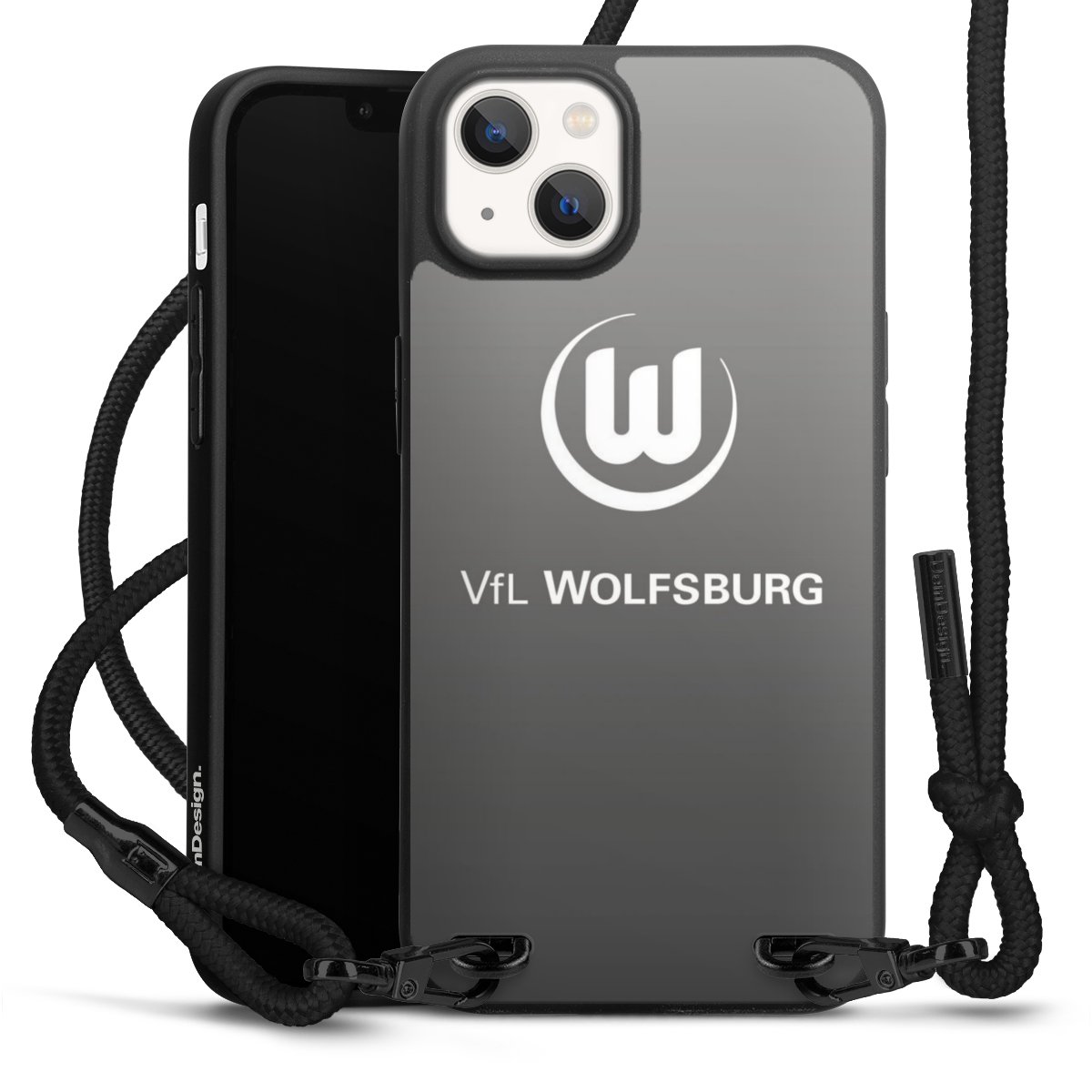 Pure Black: Handyhülle, Stoffband und Metalldetails in stylischem Mattschwarz.