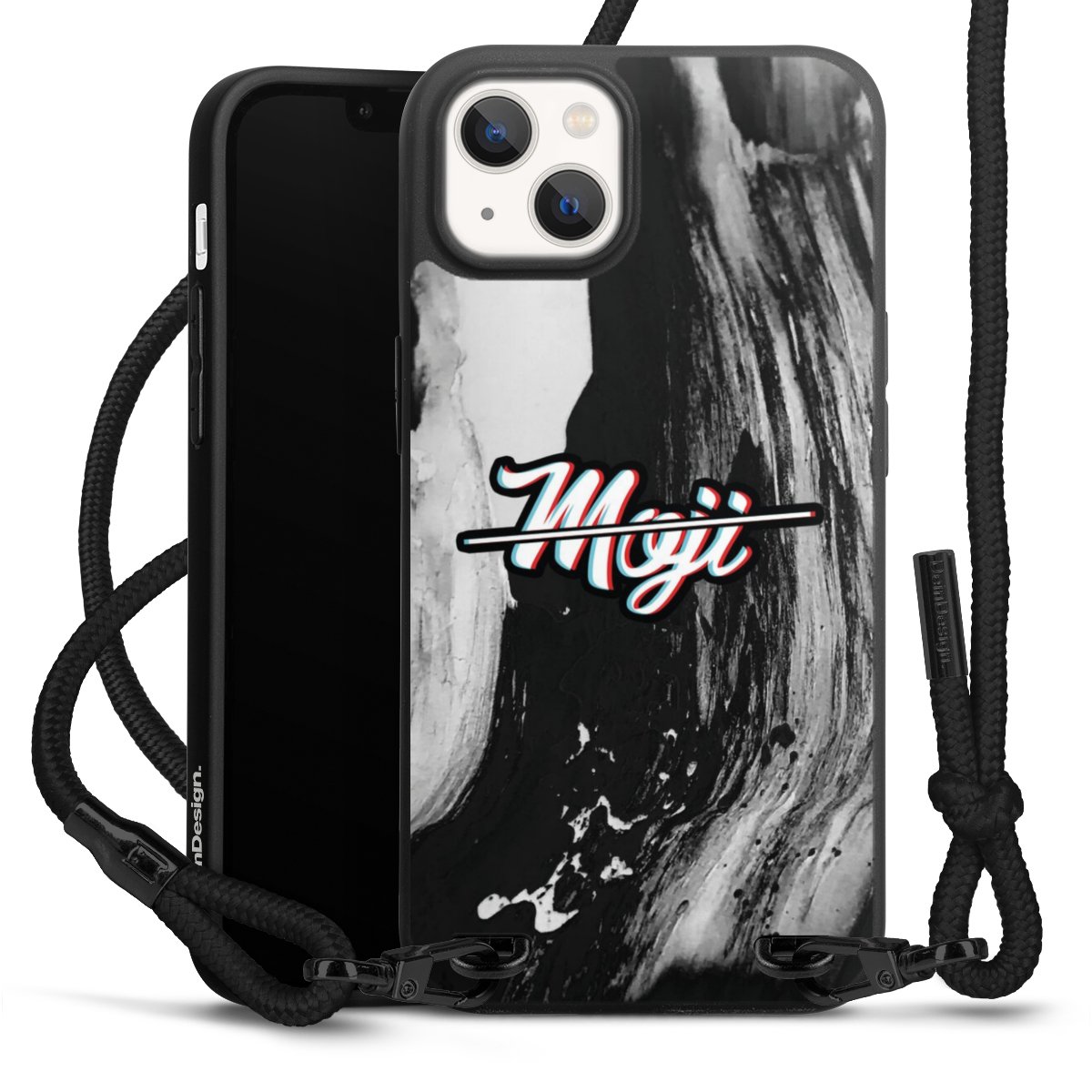 Pure Black: Handyhülle, Stoffband und Metalldetails in stylischem Mattschwarz.