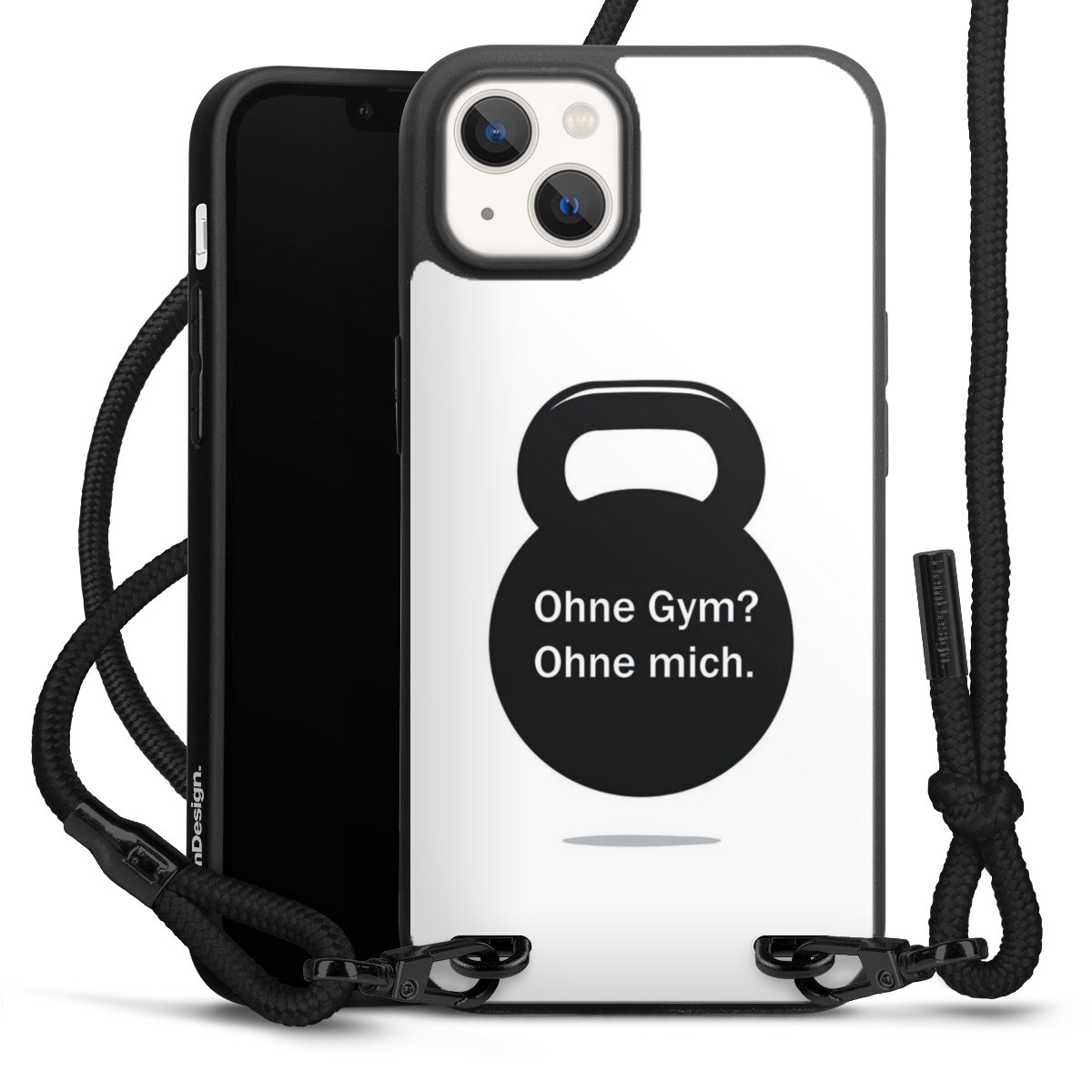Pure Black: Handyhülle, Stoffband und Metalldetails in stylischem Mattschwarz.