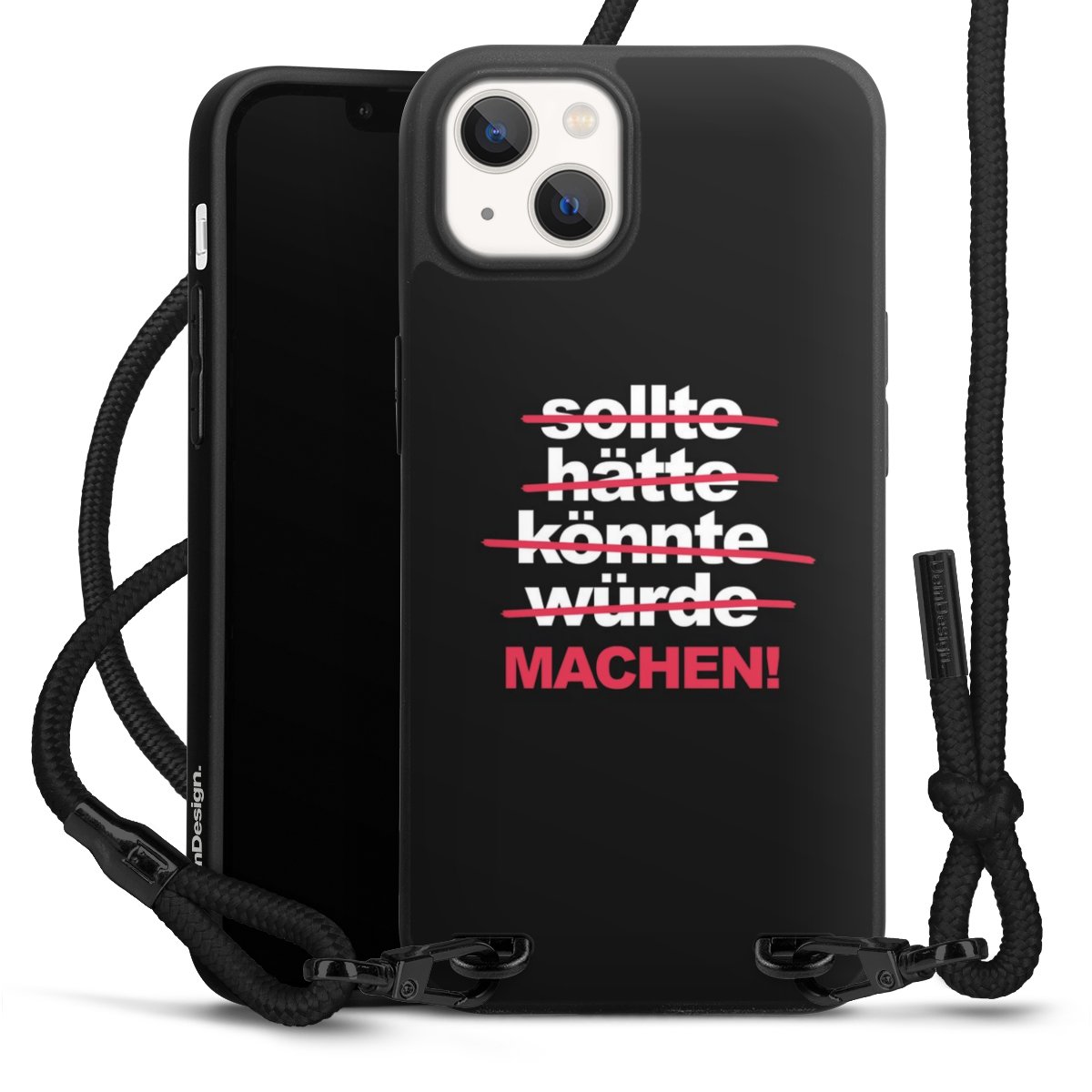 Pure Black: Handyhülle, Stoffband und Metalldetails in stylischem Mattschwarz.