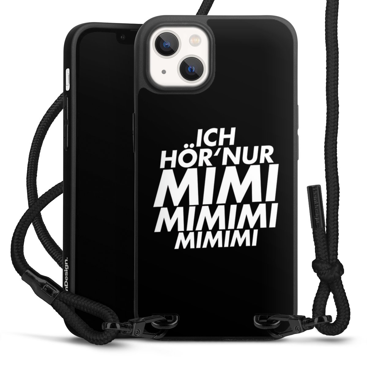 Pure Black: Handyhülle, Stoffband und Metalldetails in stylischem Mattschwarz.