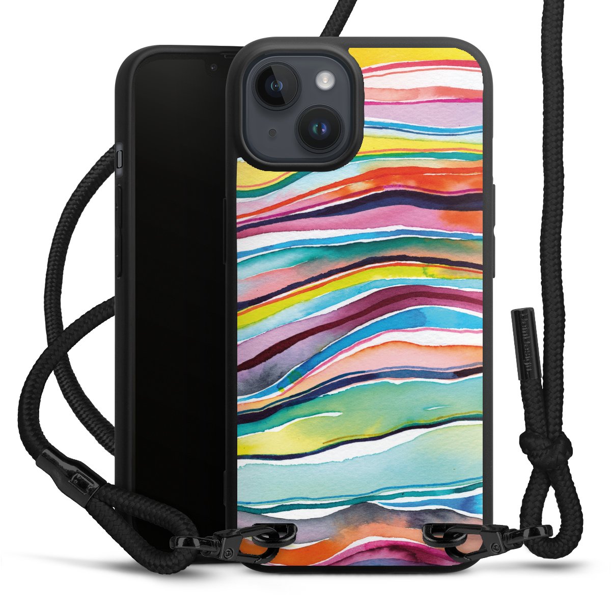 Pure Black: Handyhülle, Stoffband und Metalldetails in stylischem Mattschwarz.