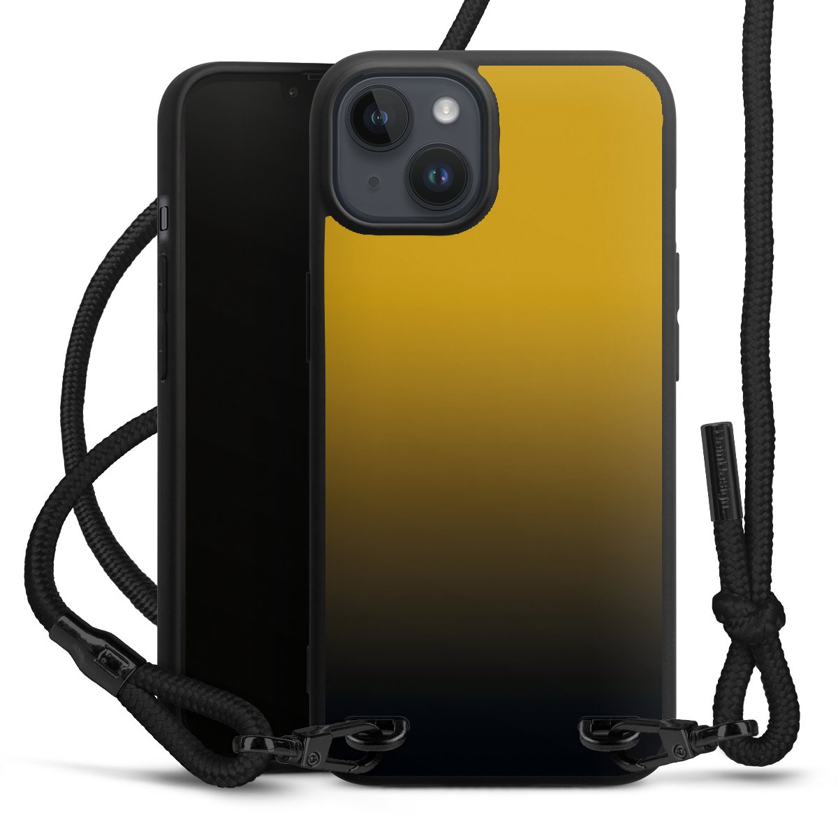 Pure Black: Handyhülle, Stoffband und Metalldetails in stylischem Mattschwarz.