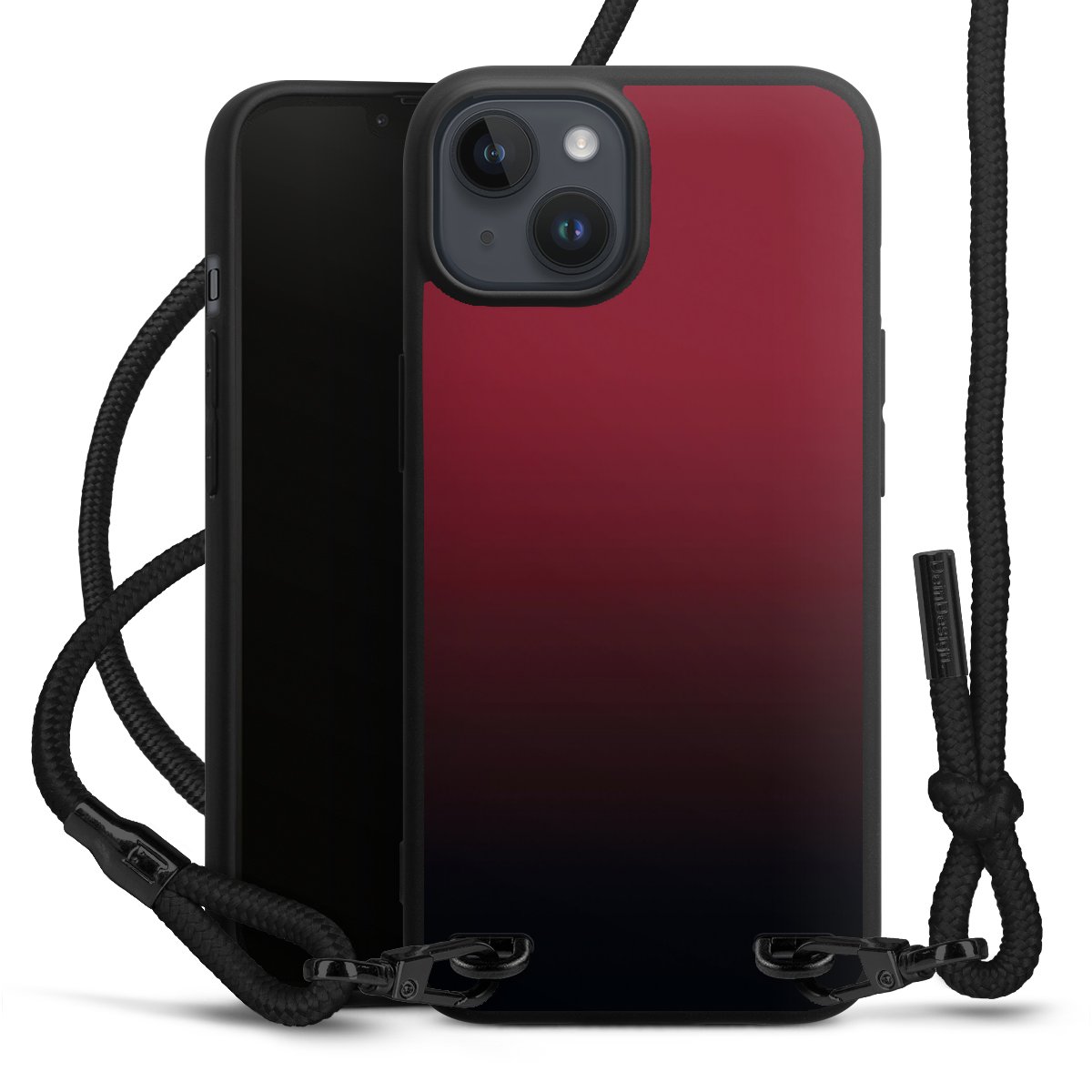 Pure Black: Handyhülle, Stoffband und Metalldetails in stylischem Mattschwarz.