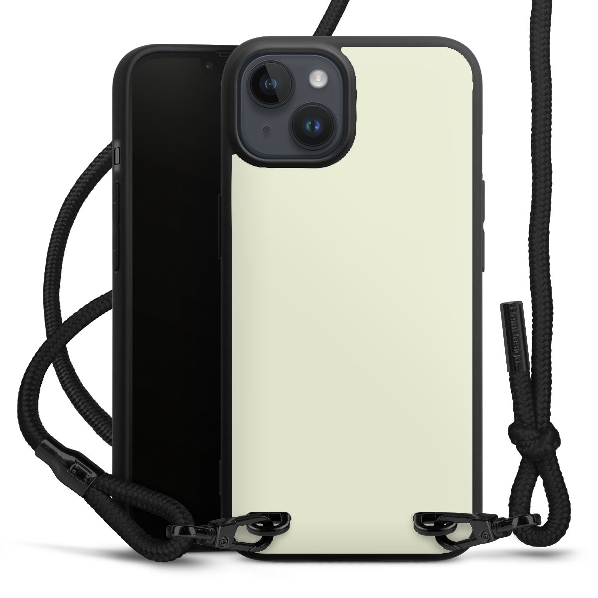 Pure Black: Handyhülle, Stoffband und Metalldetails in stylischem Mattschwarz.