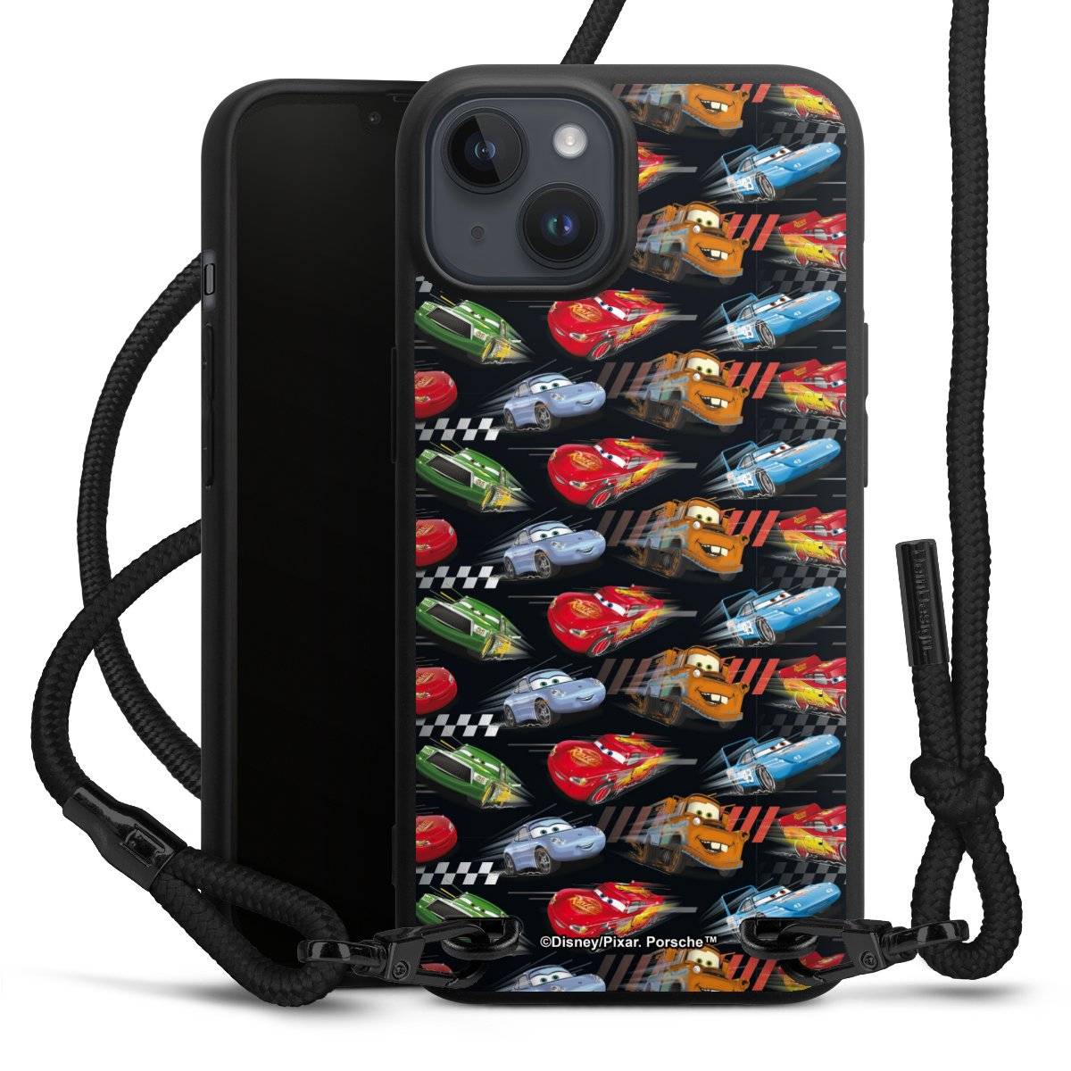 Pure Black: Handyhülle, Stoffband und Metalldetails in stylischem Mattschwarz.