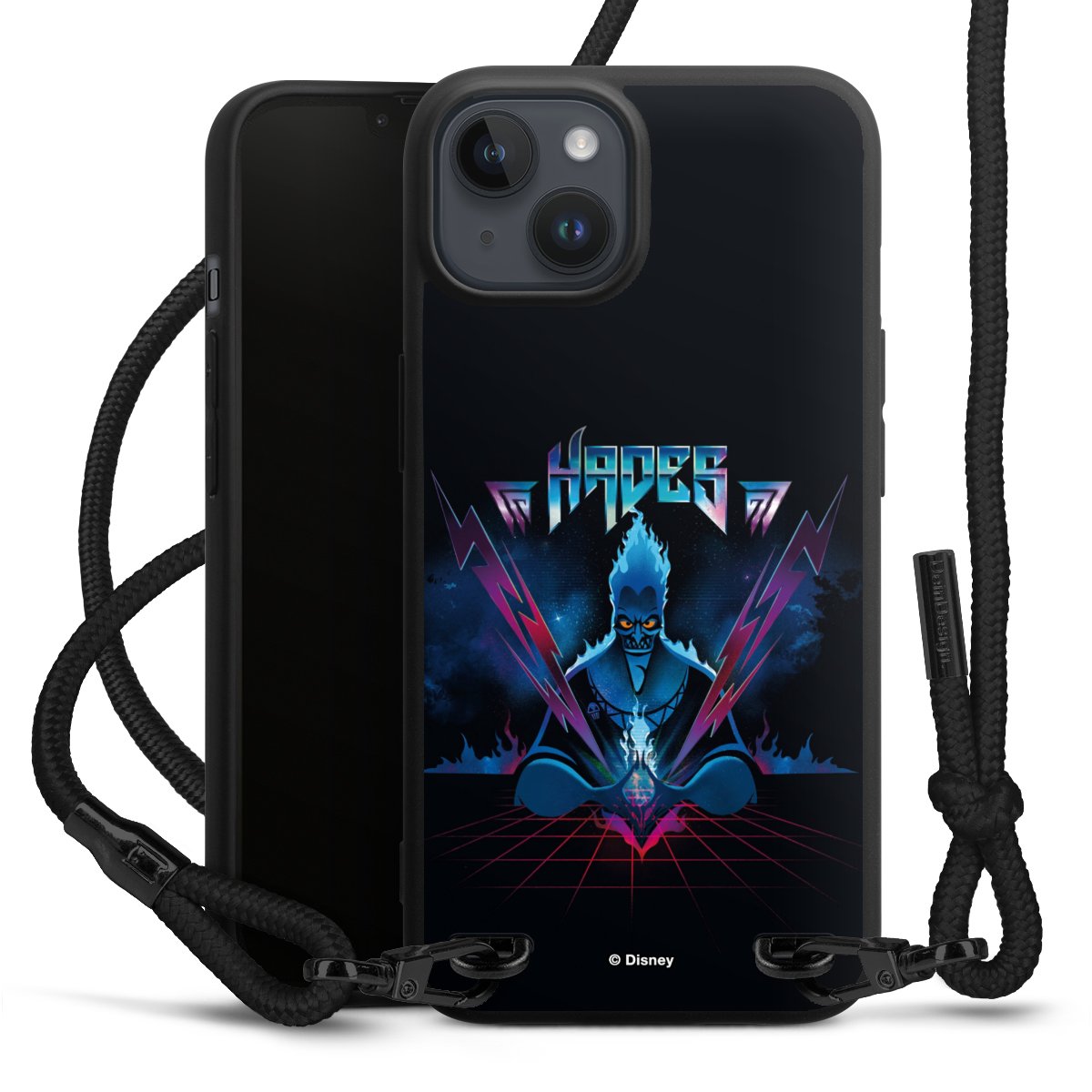 Pure Black: Handyhülle, Stoffband und Metalldetails in stylischem Mattschwarz.