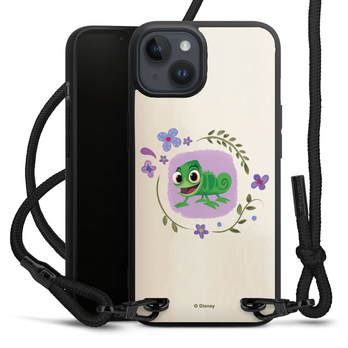 Pure Black: Handyhülle, Stoffband und Metalldetails in stylischem Mattschwarz.