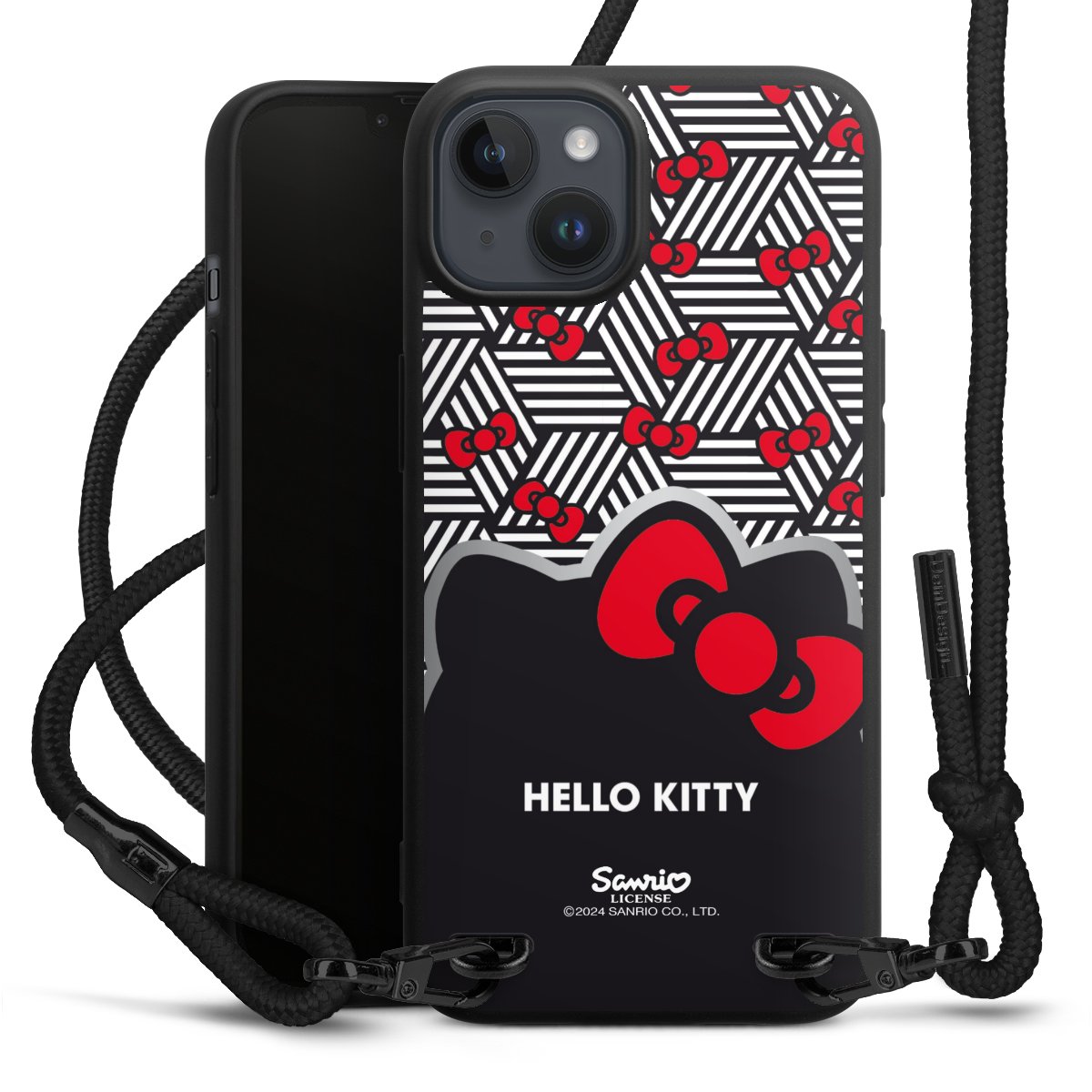 Pure Black: Handyhülle, Stoffband und Metalldetails in stylischem Mattschwarz.