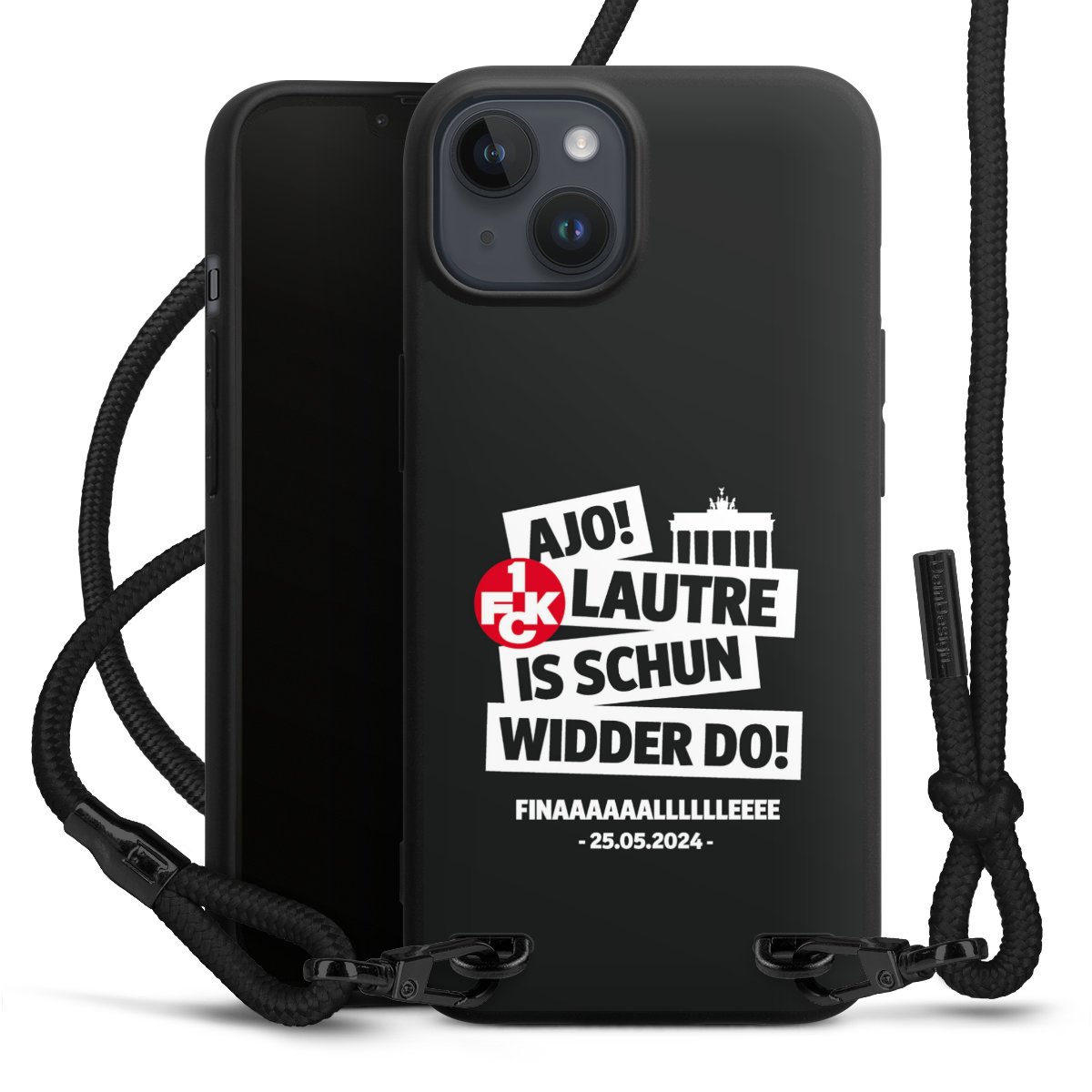 Pure Black: Handyhülle, Stoffband und Metalldetails in stylischem Mattschwarz.