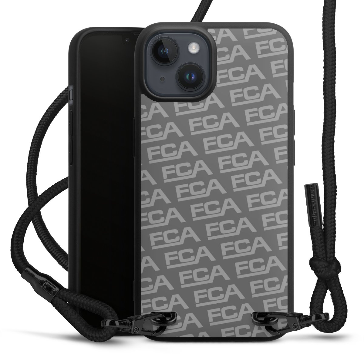Pure Black: Handyhülle, Stoffband und Metalldetails in stylischem Mattschwarz.