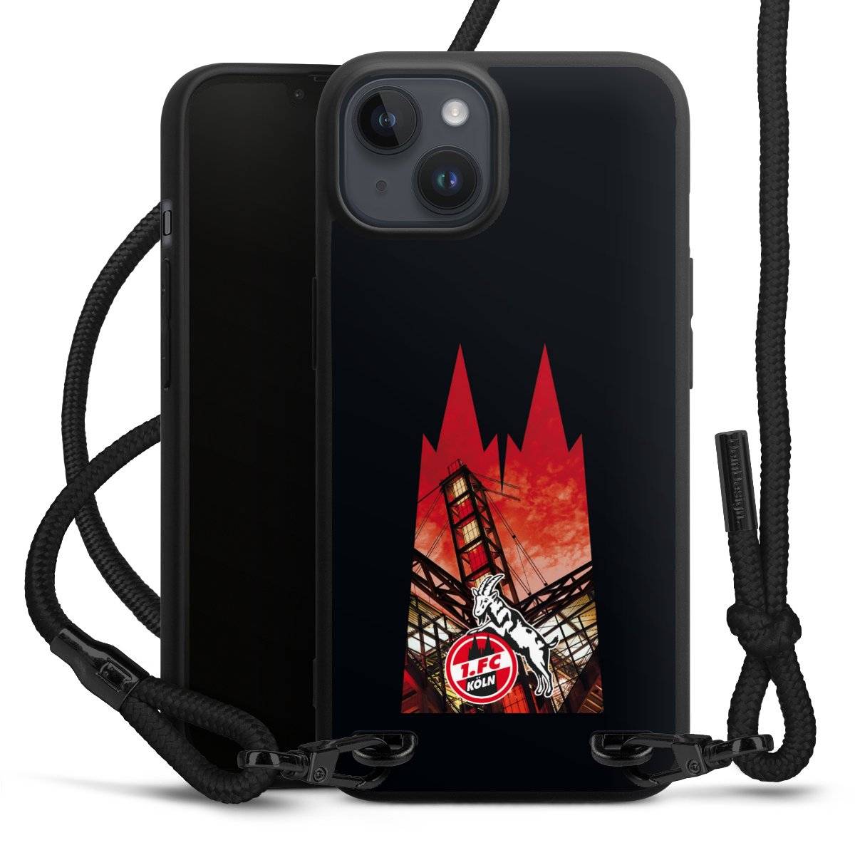 Pure Black: Handyhülle, Stoffband und Metalldetails in stylischem Mattschwarz.