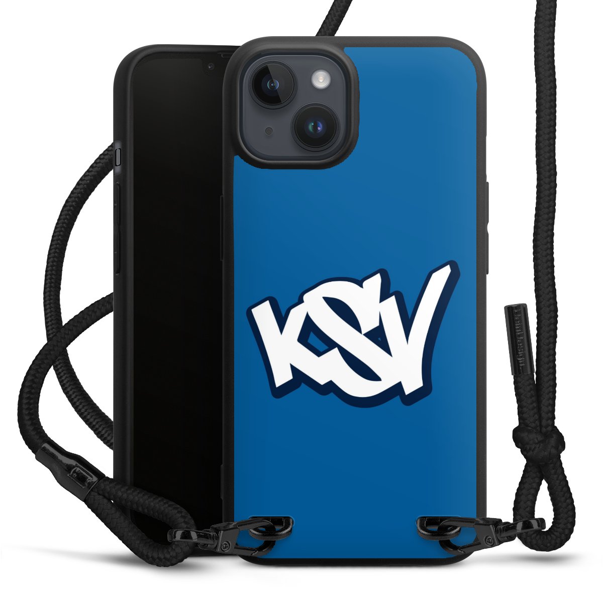 Pure Black: Handyhülle, Stoffband und Metalldetails in stylischem Mattschwarz.