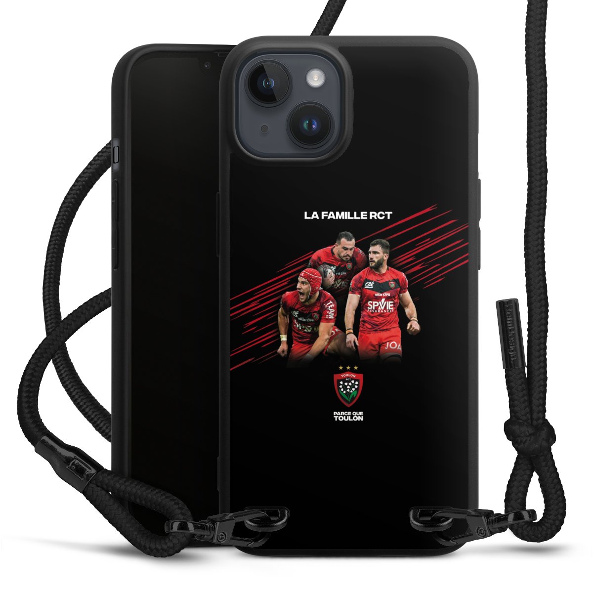 Pure Black: Handyhülle, Stoffband und Metalldetails in stylischem Mattschwarz.