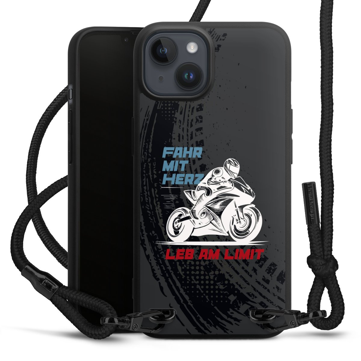 Pure Black: Handyhülle, Stoffband und Metalldetails in stylischem Mattschwarz.