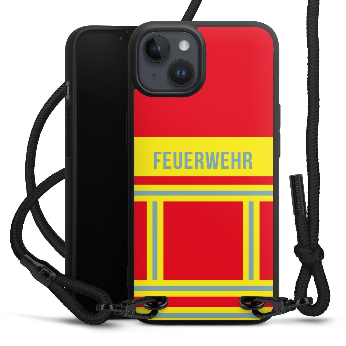 Pure Black: Handyhülle, Stoffband und Metalldetails in stylischem Mattschwarz.
