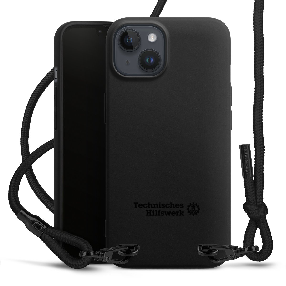 Pure Black: Handyhülle, Stoffband und Metalldetails in stylischem Mattschwarz.