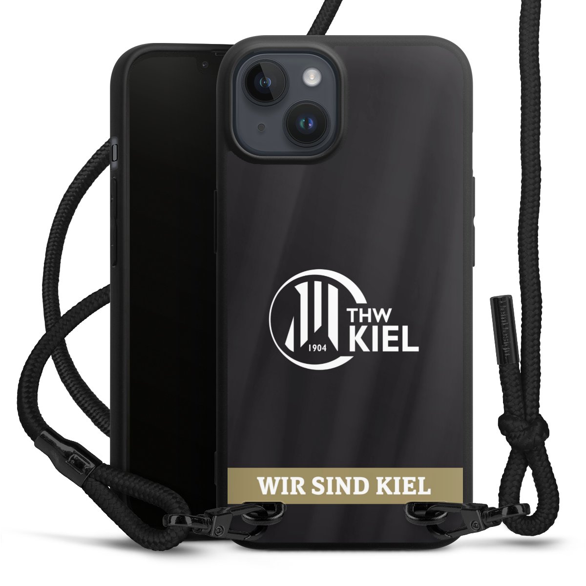 Pure Black: Handyhülle, Stoffband und Metalldetails in stylischem Mattschwarz.
