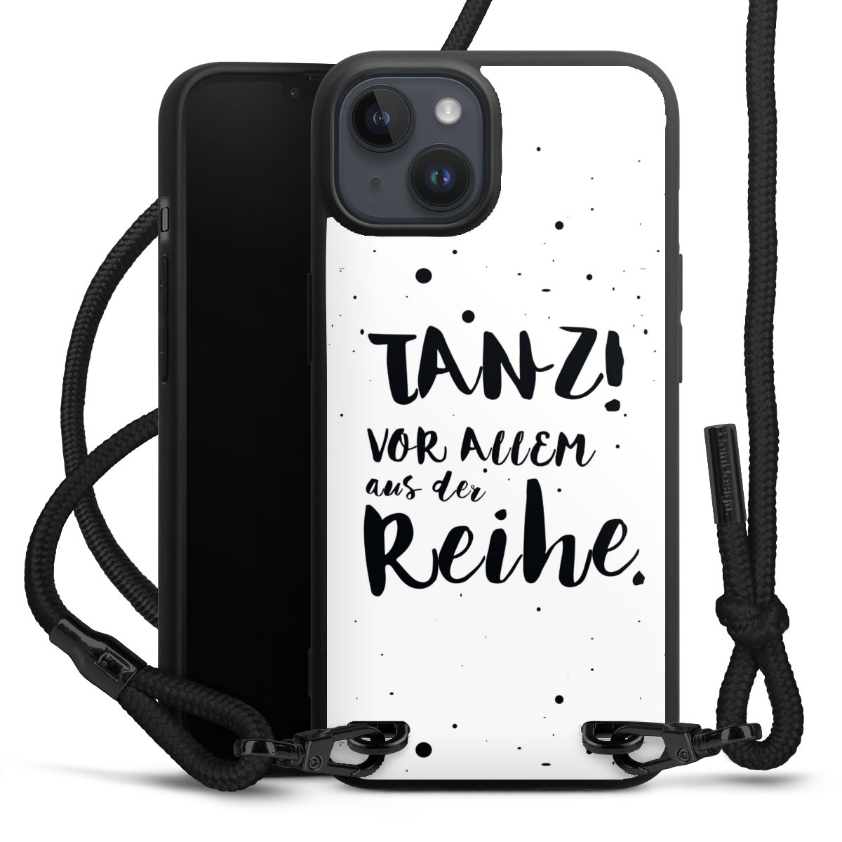 Pure Black: Handyhülle, Stoffband und Metalldetails in stylischem Mattschwarz.