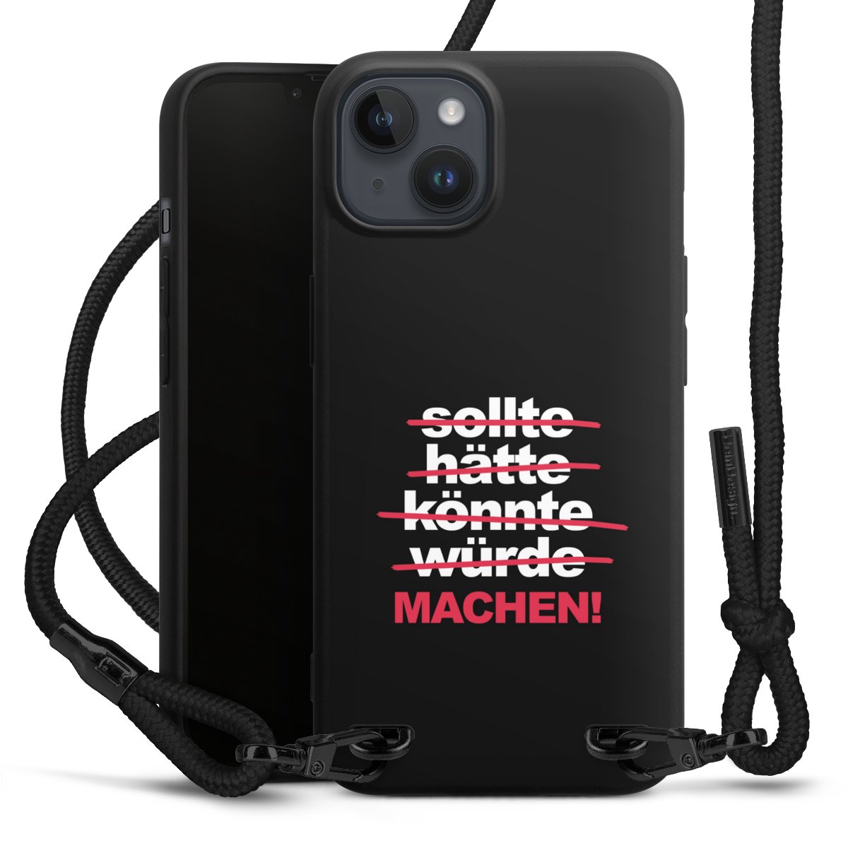 Pure Black: Handyhülle, Stoffband und Metalldetails in stylischem Mattschwarz.