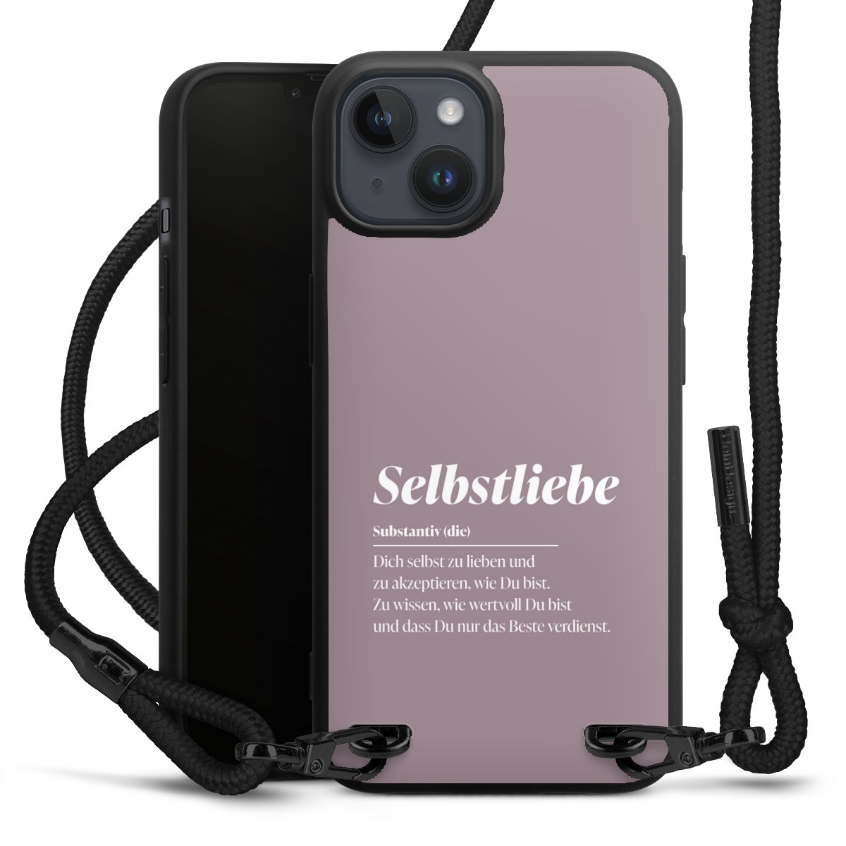 Pure Black: Handyhülle, Stoffband und Metalldetails in stylischem Mattschwarz.