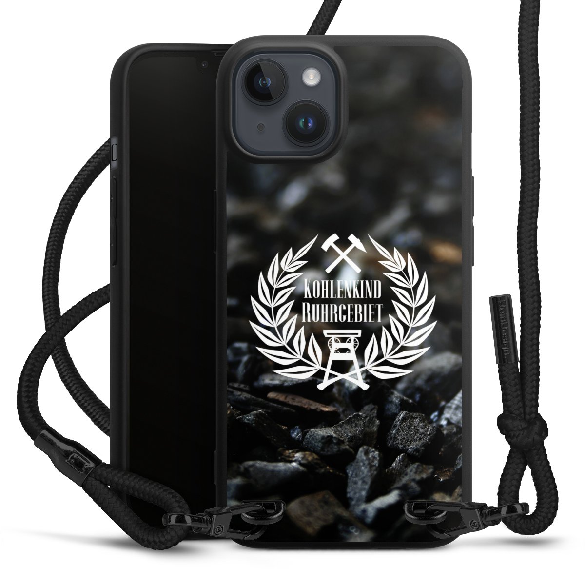 Pure Black: Handyhülle, Stoffband und Metalldetails in stylischem Mattschwarz.