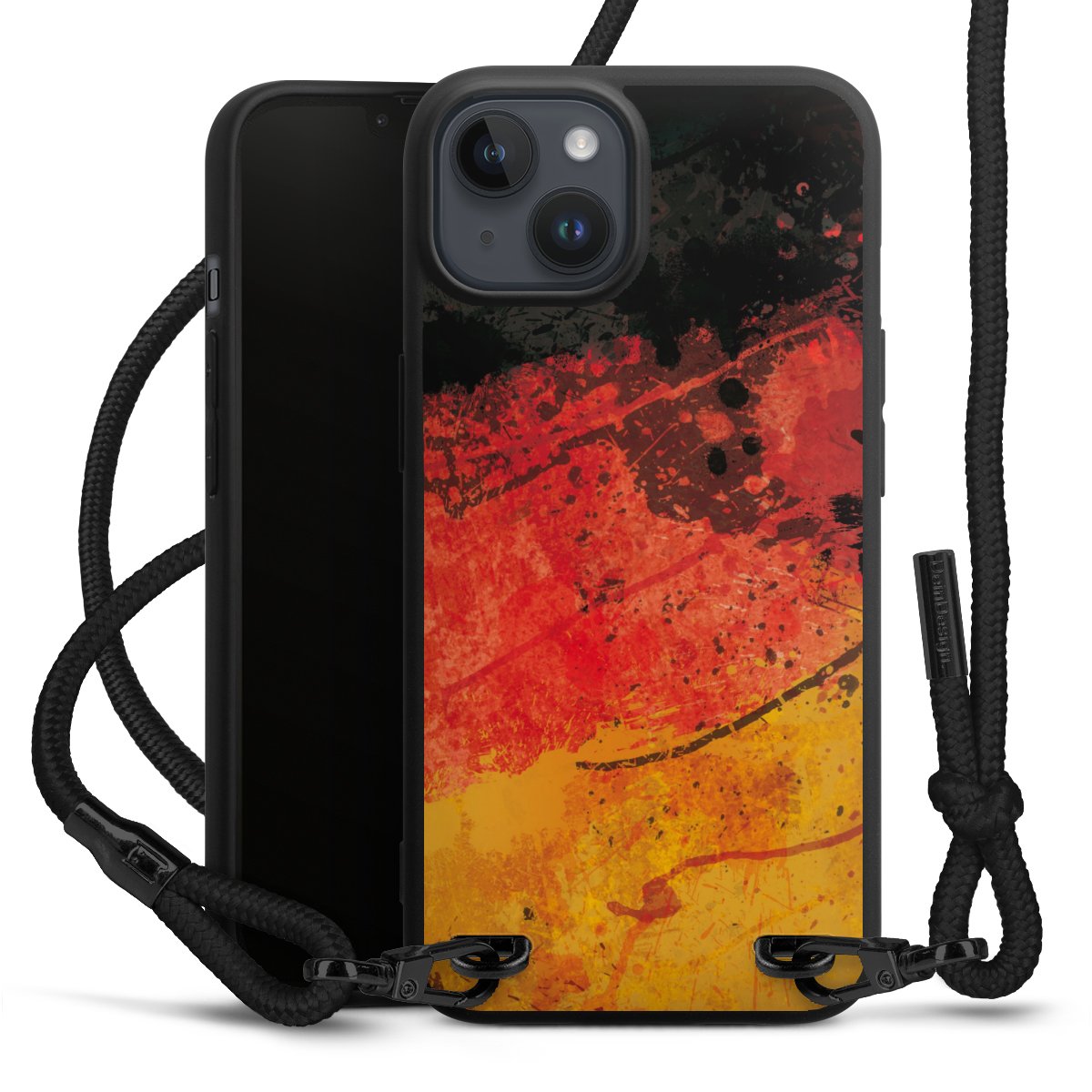 Pure Black: Handyhülle, Stoffband und Metalldetails in stylischem Mattschwarz.