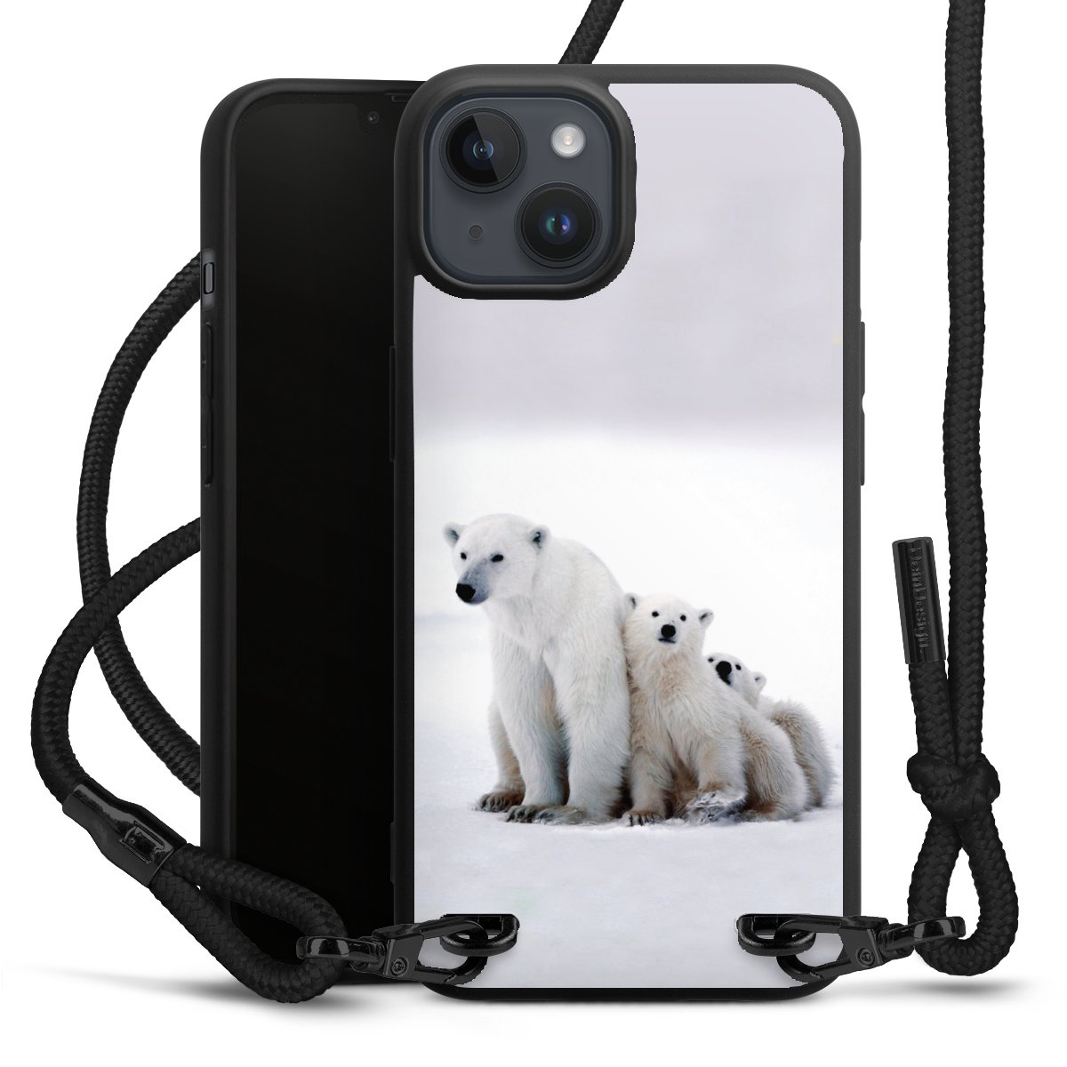 Pure Black: Handyhülle, Stoffband und Metalldetails in stylischem Mattschwarz.