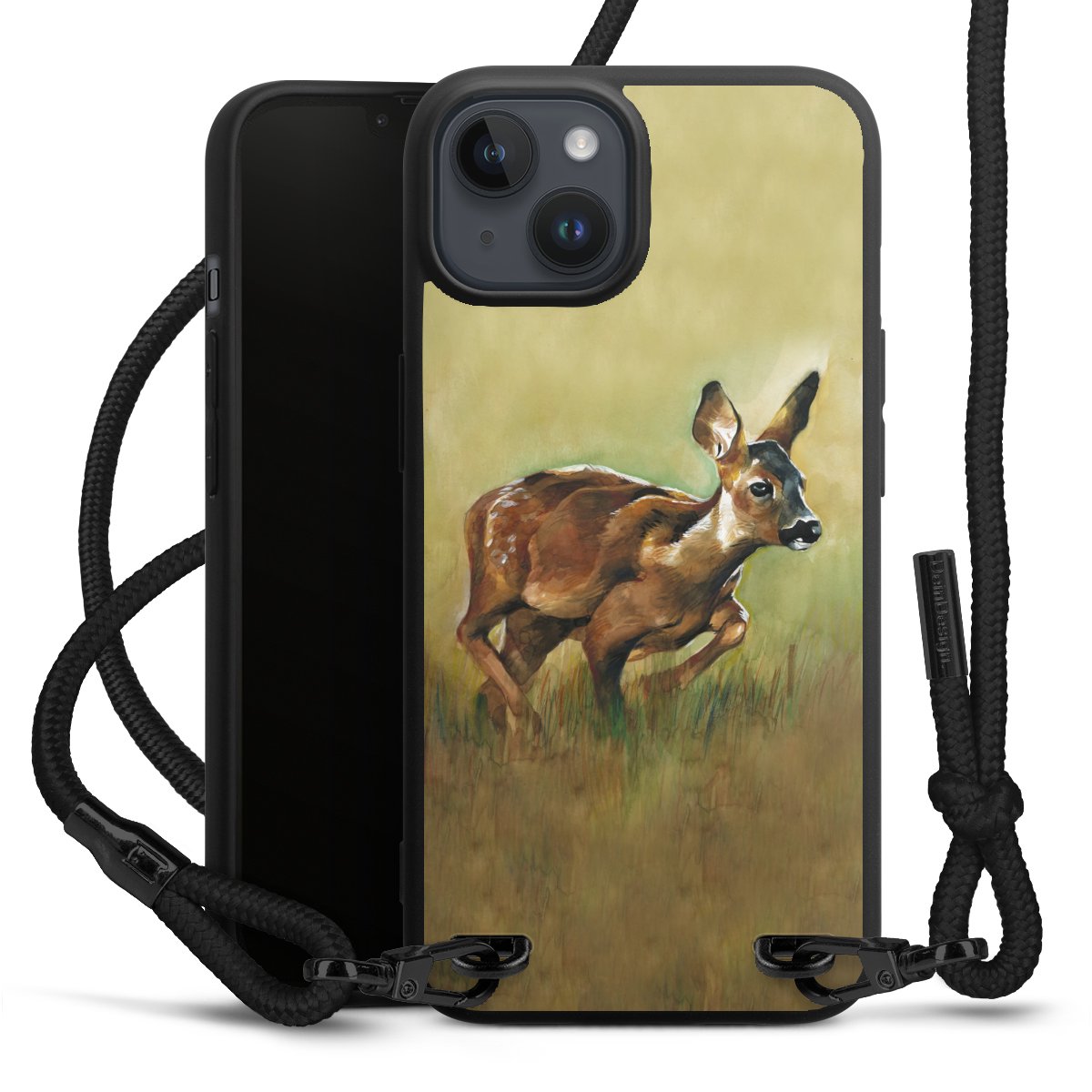 Pure Black: Handyhülle, Stoffband und Metalldetails in stylischem Mattschwarz.