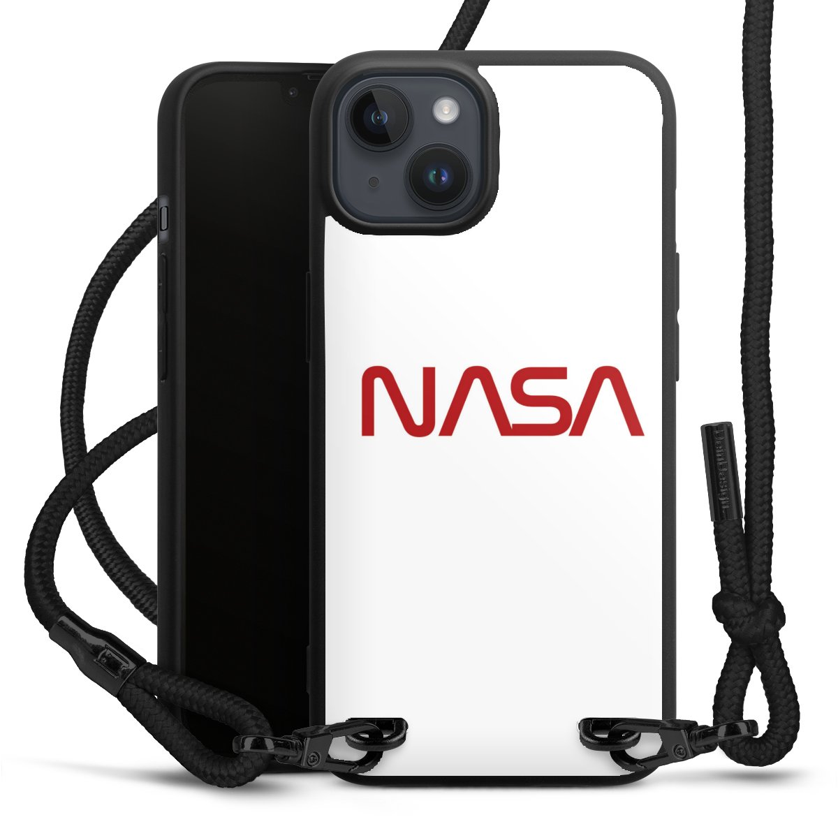 Pure Black: Handyhülle, Stoffband und Metalldetails in stylischem Mattschwarz.