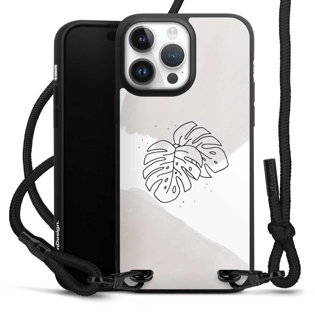 Pure Black: Handyhülle, Stoffband und Metalldetails in stylischem Mattschwarz.