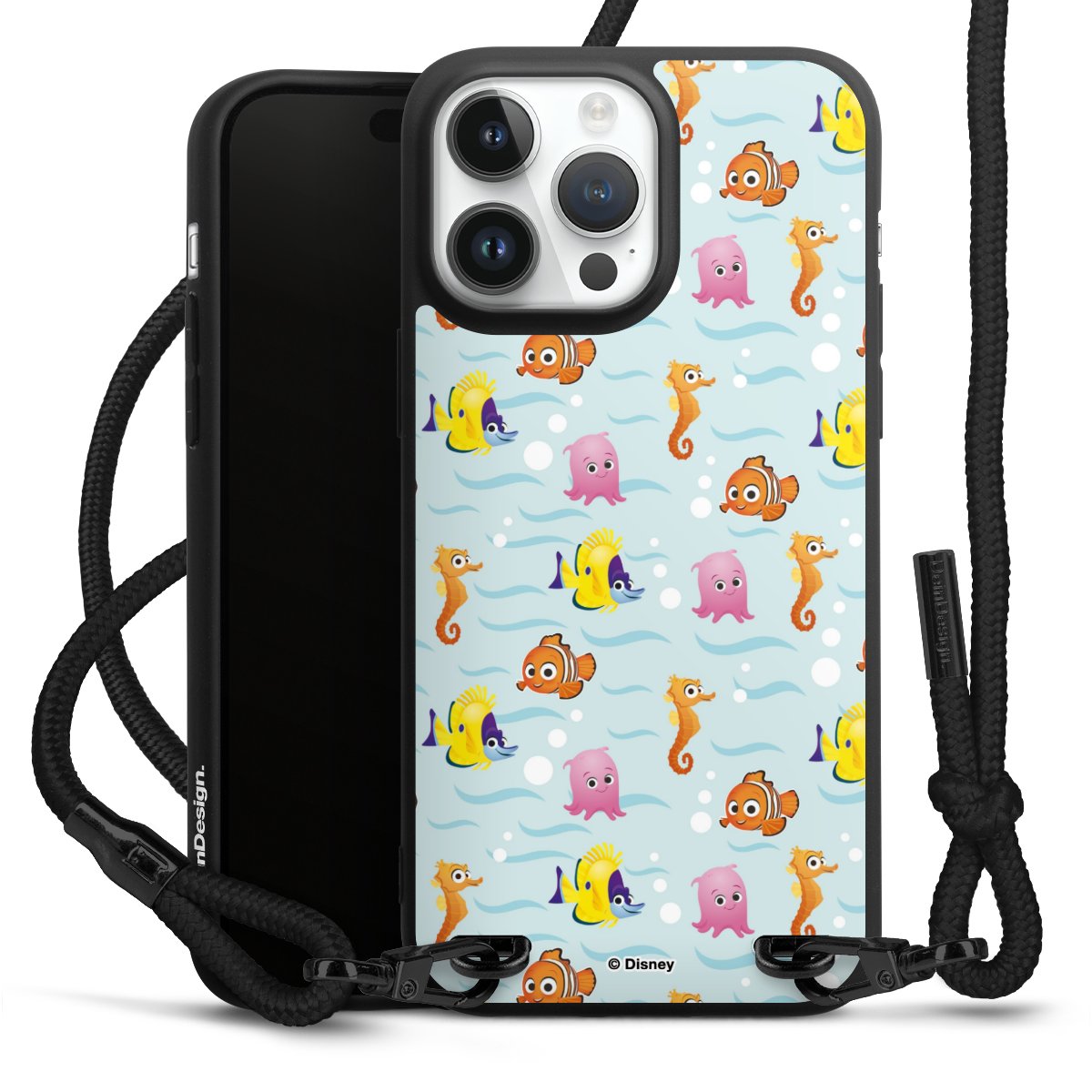 Pure Black: Handyhülle, Stoffband und Metalldetails in stylischem Mattschwarz.